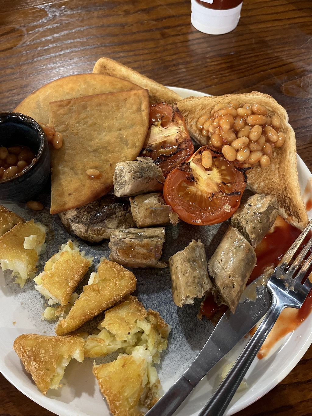 I ordered the breakfast on a Wednesday afternoon. We were the only customers. The breakfast was really not nice - the sausages were very hard and clearly overcooked, beans looked like they’d been out for hours as were congealed, the mushroom was very spicy so had clearly been on a grill with something else and the tattie scones ok. No vegan butter for the toast and not enough beans to put on the toast so had dry toast too. The hash browns were poor quality in my opinion and didn’t taste of anything other than deep fryers so didn’t enjoy that really either.