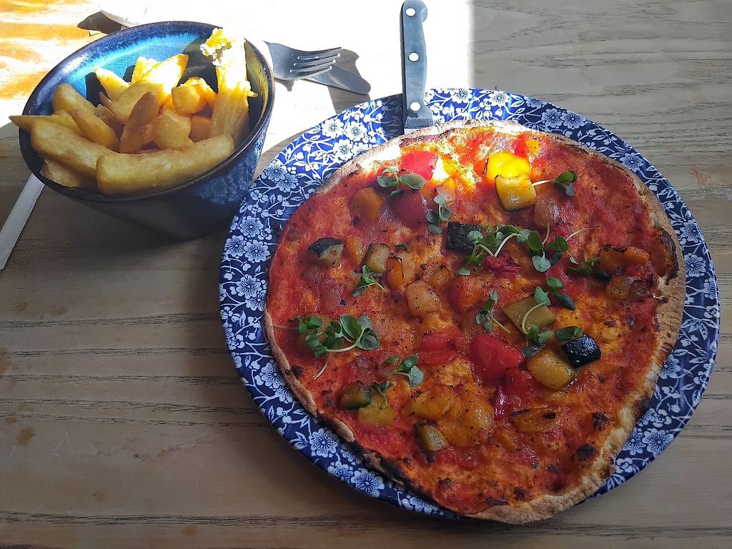 I got a vegan 8 inch roasted vegetable pizza that me and my friend shared with a portion of chips, a very nice lunch, place was clean and staff were polite, recommended 😁, wish there had been an option for a vegan dessert. Prices are affordable which is great in my opinion
