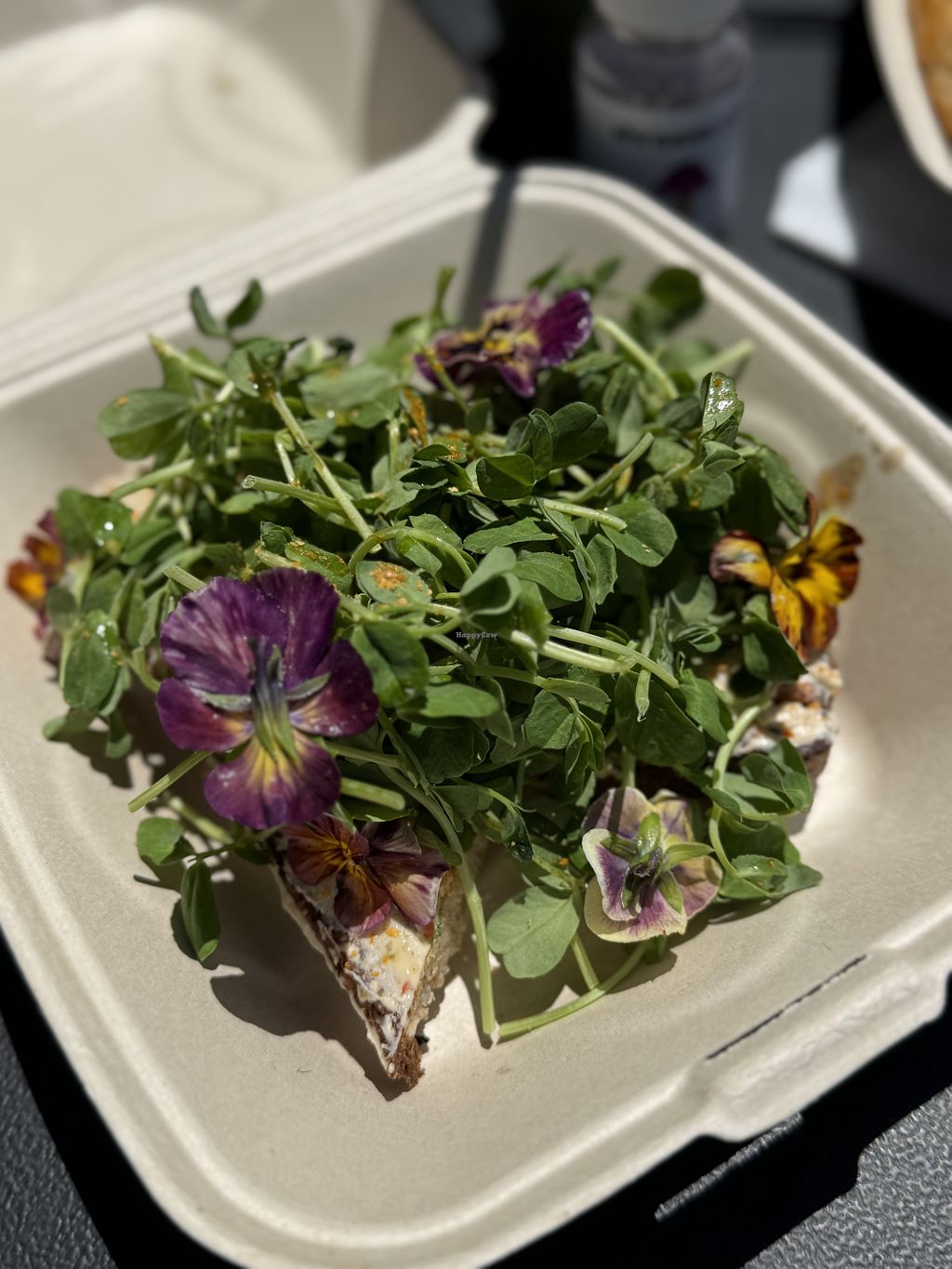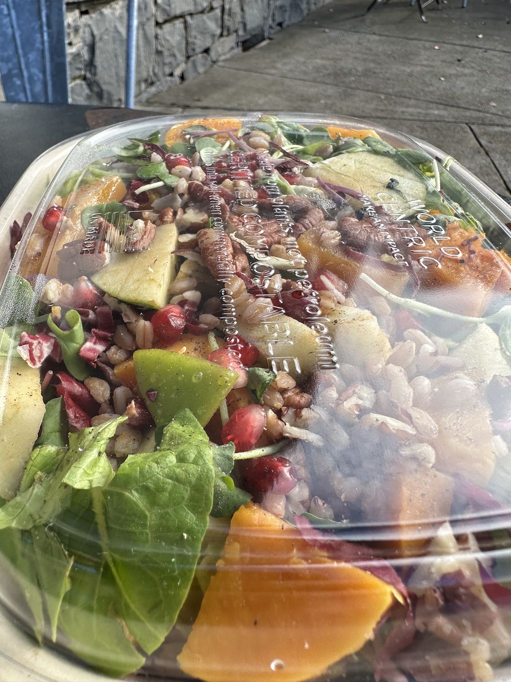 Kale salad and bagel with avocado and sprouts, organic coffee, too!