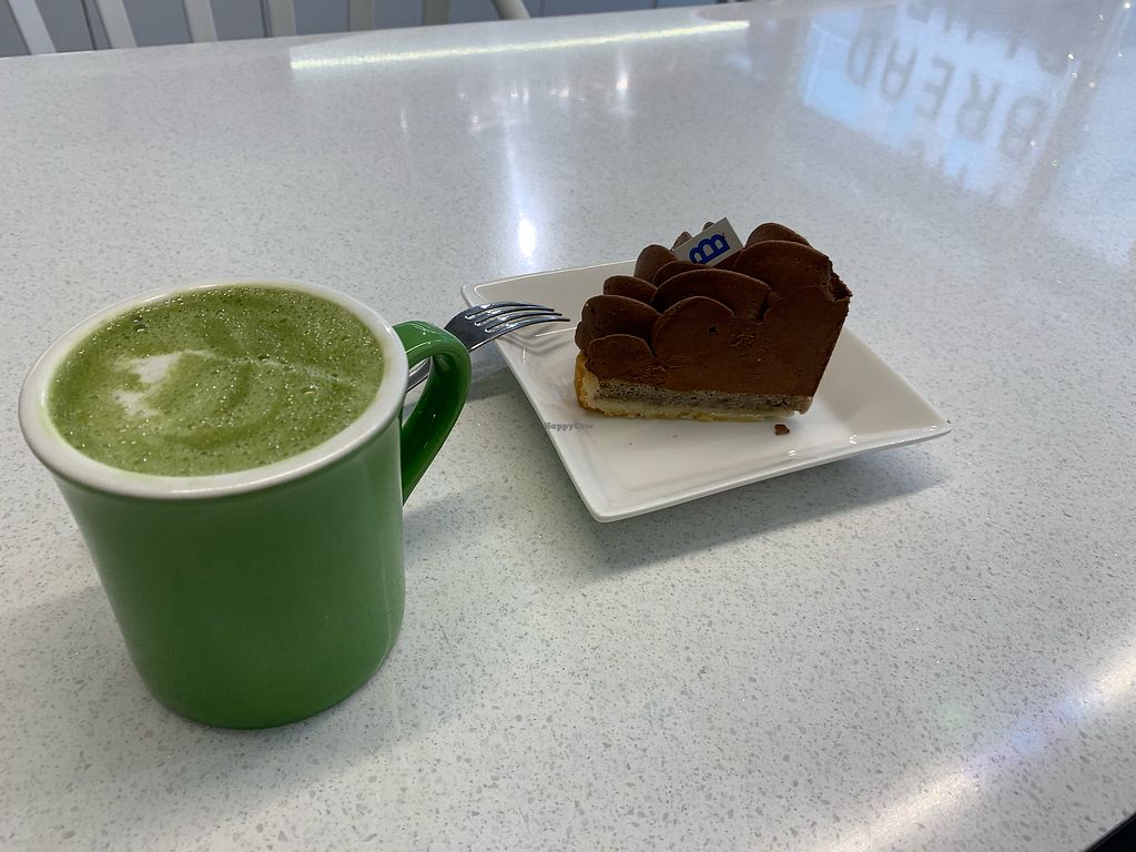 Matcha latte and potato bread