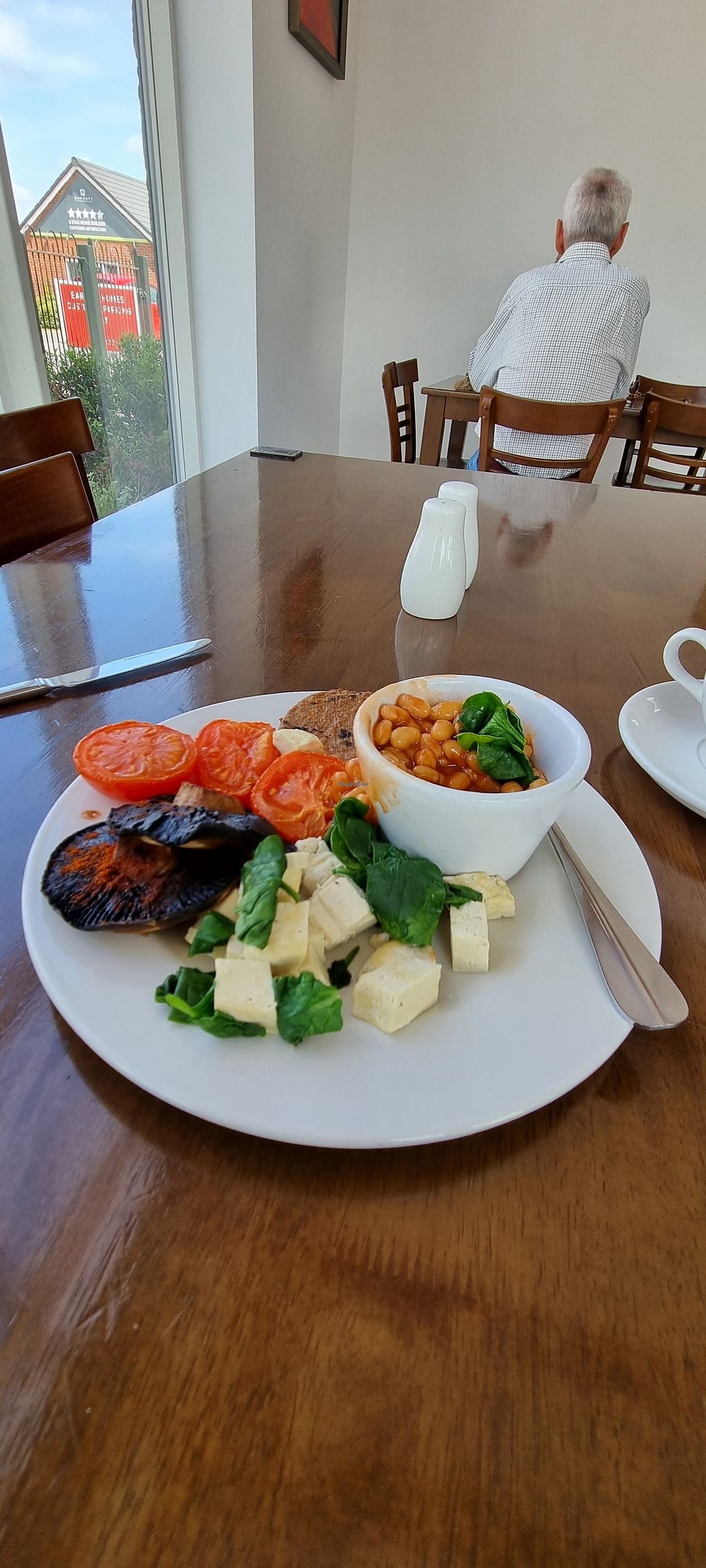 Serves meat, vegan options available. A modern café with a few vegan options labelled on the menu. Includes a vegan breakfast with scrambled tofu and toast with vegan spread, a tofu wrap and a falafel burger. Reported closed, June '23.