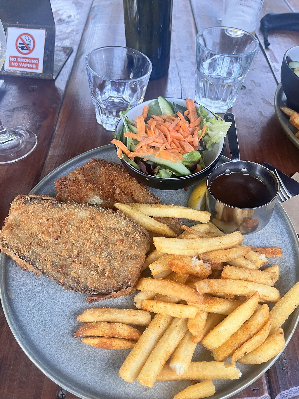 Was great to find a gluten free option for a schnitzel. Mock chicken schnitzel also available. Both options are big servings with dressing, plenty of chips and delicious!!