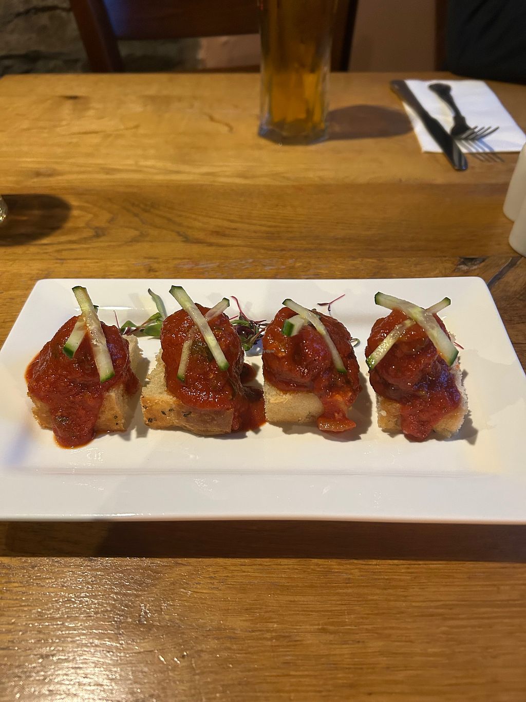 We were lucky to visit during the final week of their current menu. For starters, we had the vegan fishcake served with garlic mayo and tomato salsa—unbelievably realistic and delicious—alongside perfectly seasoned meatless meatballs on toasted focaccia.