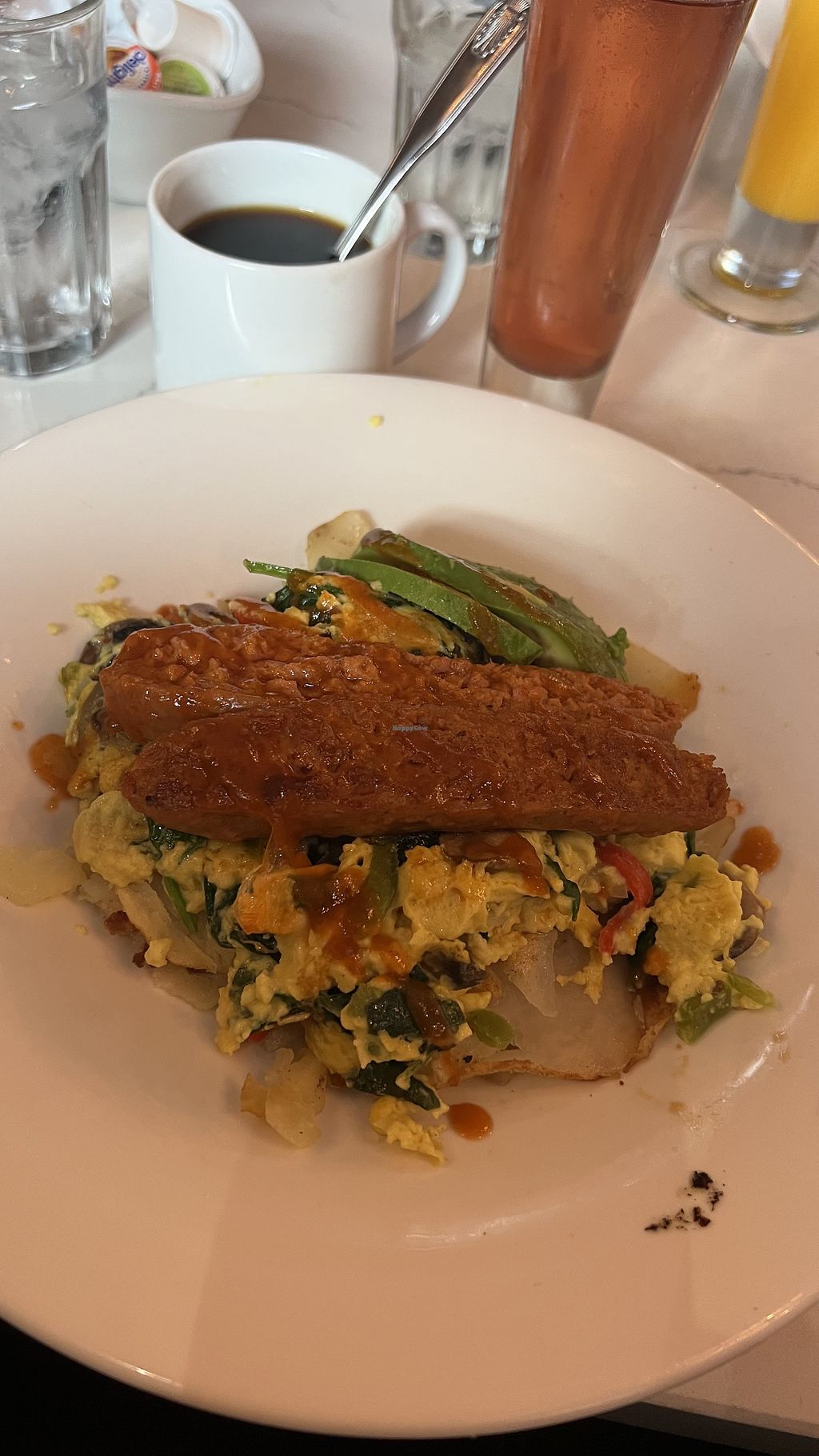 They seem to have recently added a few more vegan options and updated the menu to clearly ID vegan/vegetarian options. I ordered the spicy vegan bowl (Just Egg scrambled with spinach, mushroom, onion, green and red bell pepper over home fries and topped with BEYOND SAUSAGE® hot Italian link, avocado and sriracha.)