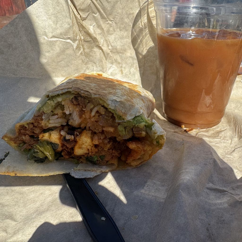 Serves meat, vegan options available. Small cafe across the street from the beach. Has acai bowls, avocado toast, and vegetarian tacos & burritos (omit dairy to make vegan). Also has almond milk for coffee. Open Mon-Thu 7:00am-1:00pm, Fri-Sun 7:00am-2:00pm.
