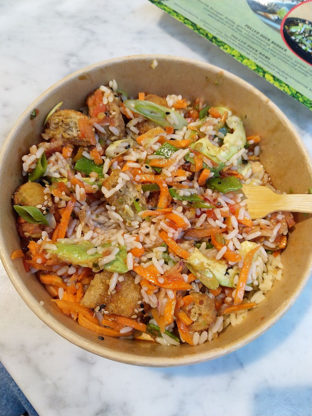 Serves meat, vegan options available. Airport restaurant with vegan choices. Menu includes vegan pita, buddha bowls, burgers and smoothie bowls. Vegan options served with either tofu or Beyond Meat. Reported closed July 2025.