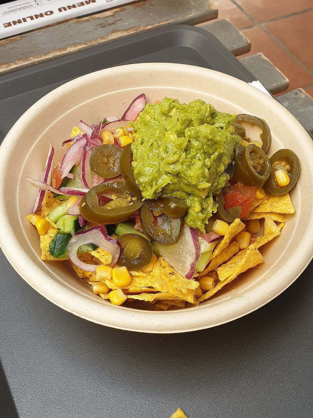 All vegan: tacos, fries, burger, and buddha bowl with udon.