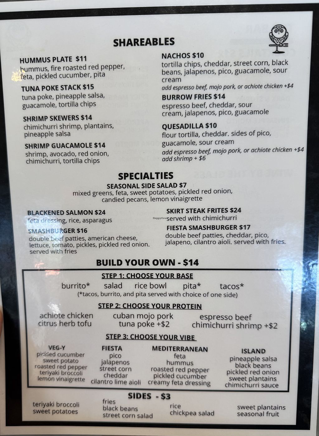 Serves meat, vegan options available. An upscale casual sit-down and takeout restaurant, bar, and coffee shop. Vegan options include a customizable 'build a bowl' with tofu, rice, and beans, as well as a vegan burrito, vegan salad bowl, and vegan rice bowl. Open Mon-Sun 8:00am-9:00pm. call to verify hours.