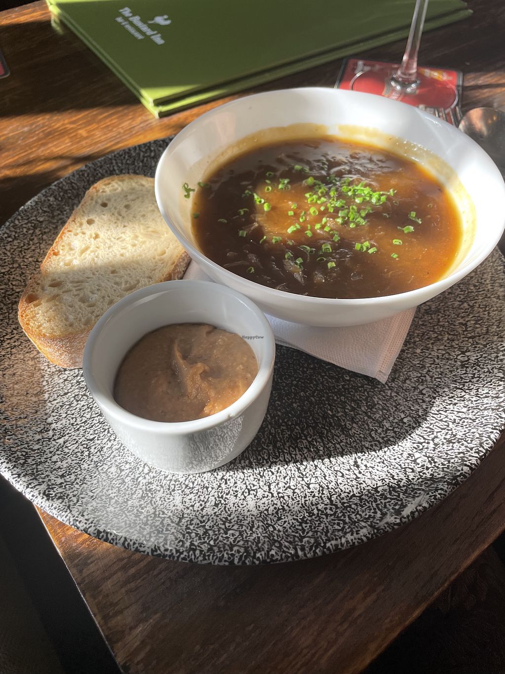 We enjoyed vegan French onion soup with Hummous yesterday. We made an impromptu visit after checking the Happy Cow app. The pub is lovely with outside seating in an attractive garden. There were a few vegan options on the menu and a member of staff said the menu was being reviewed and would include more vegan deserts.