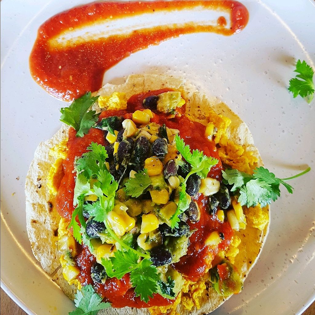 Rancheros - Corn tortilla, scrambled tofu, rancheros sauce and black b…