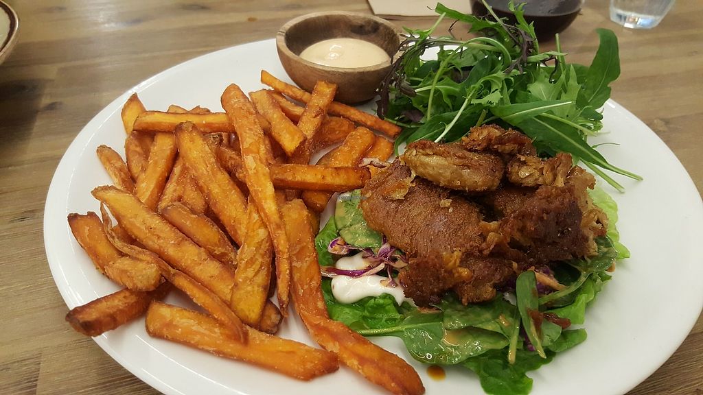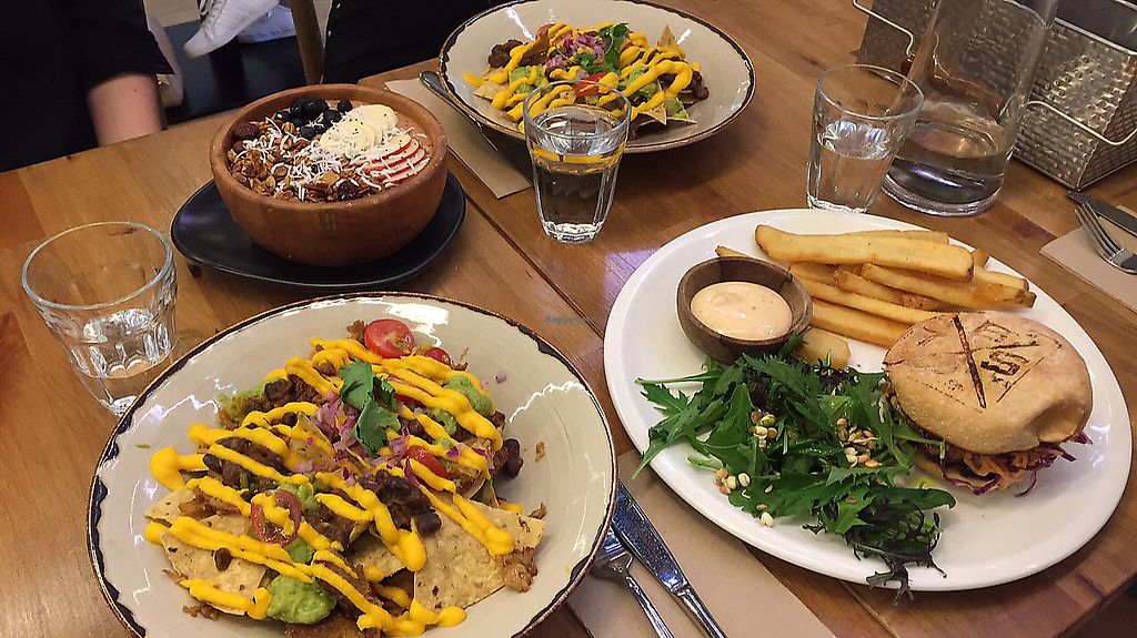 Nachos, “chicken” burger and “cacao pow” smoothie bowl