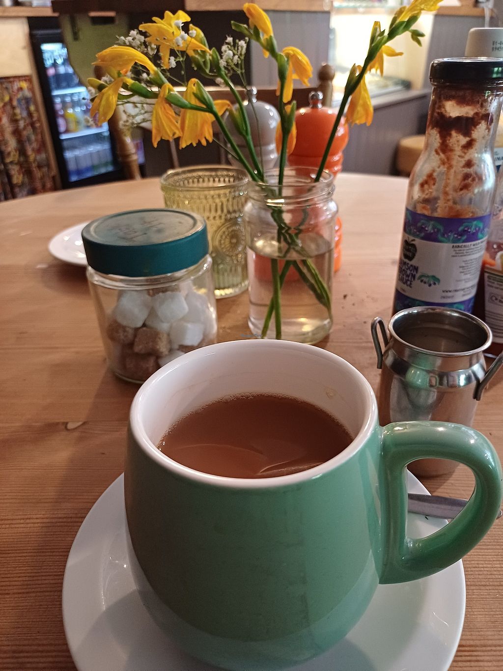 Serves meat, vegan options available. Usually offers a vegan cake or 2, a vegan full English breakfast and often has a curry that is vegan, soups are usually vegan and also often has vegan cheese. Also has plant milks available. Open Mon-Sat 09:00-17:00, Sun 10:00-16:00.