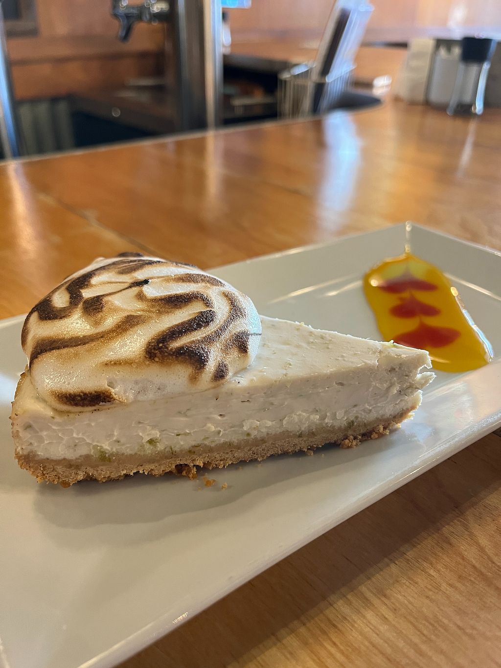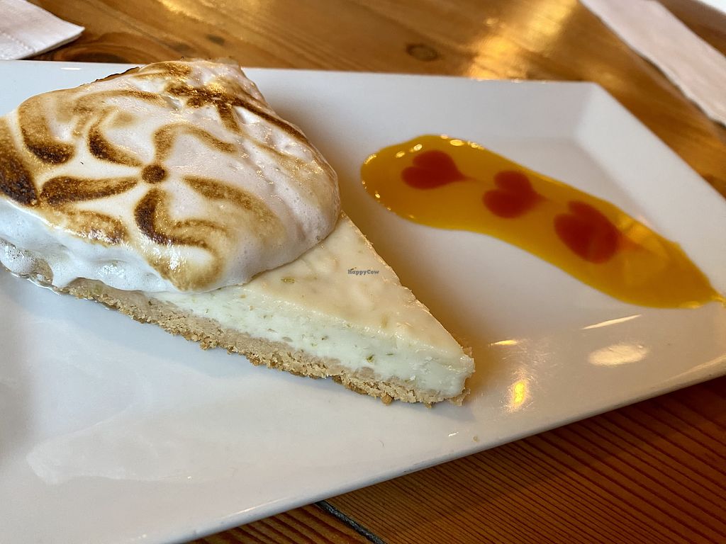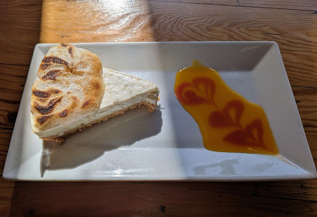 Vegan key lime cheesecake with pineapple sauce on the side