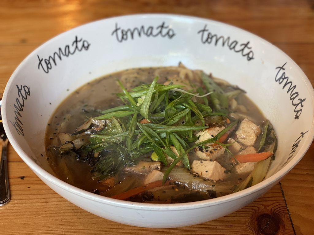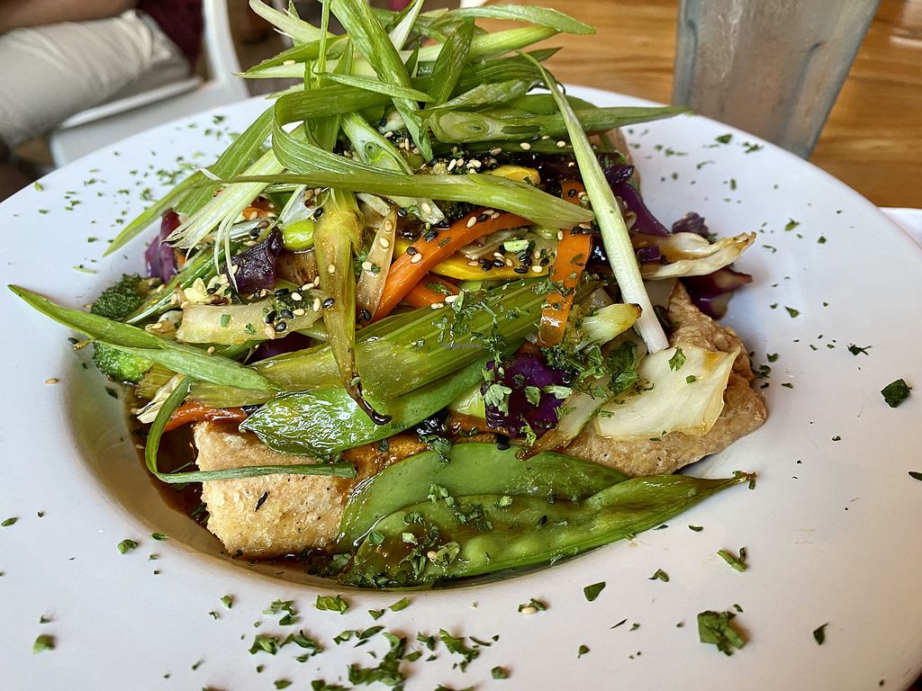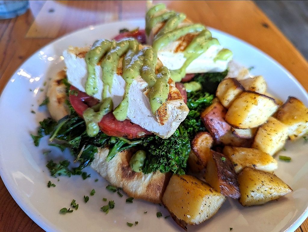 Grilled Tofu Benedict with sauteed kale, grilled tomatoes, avocado hol…