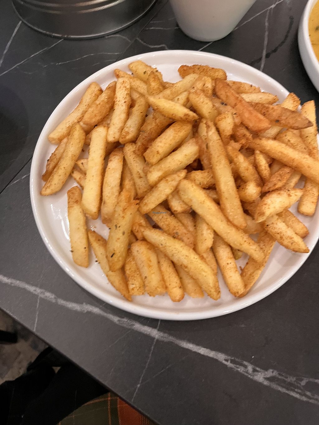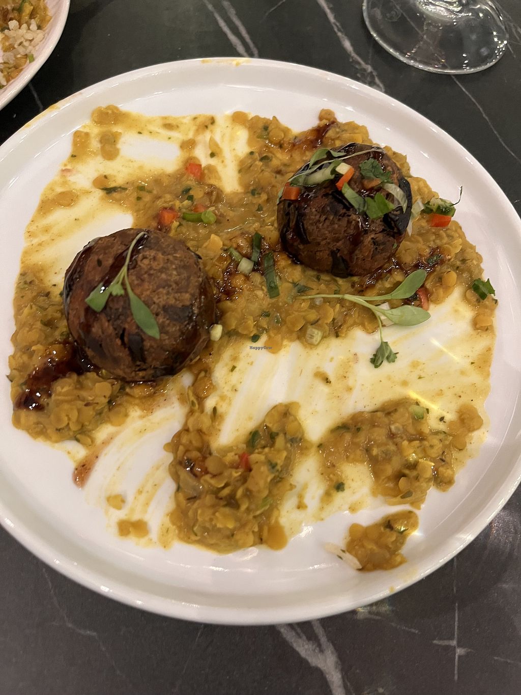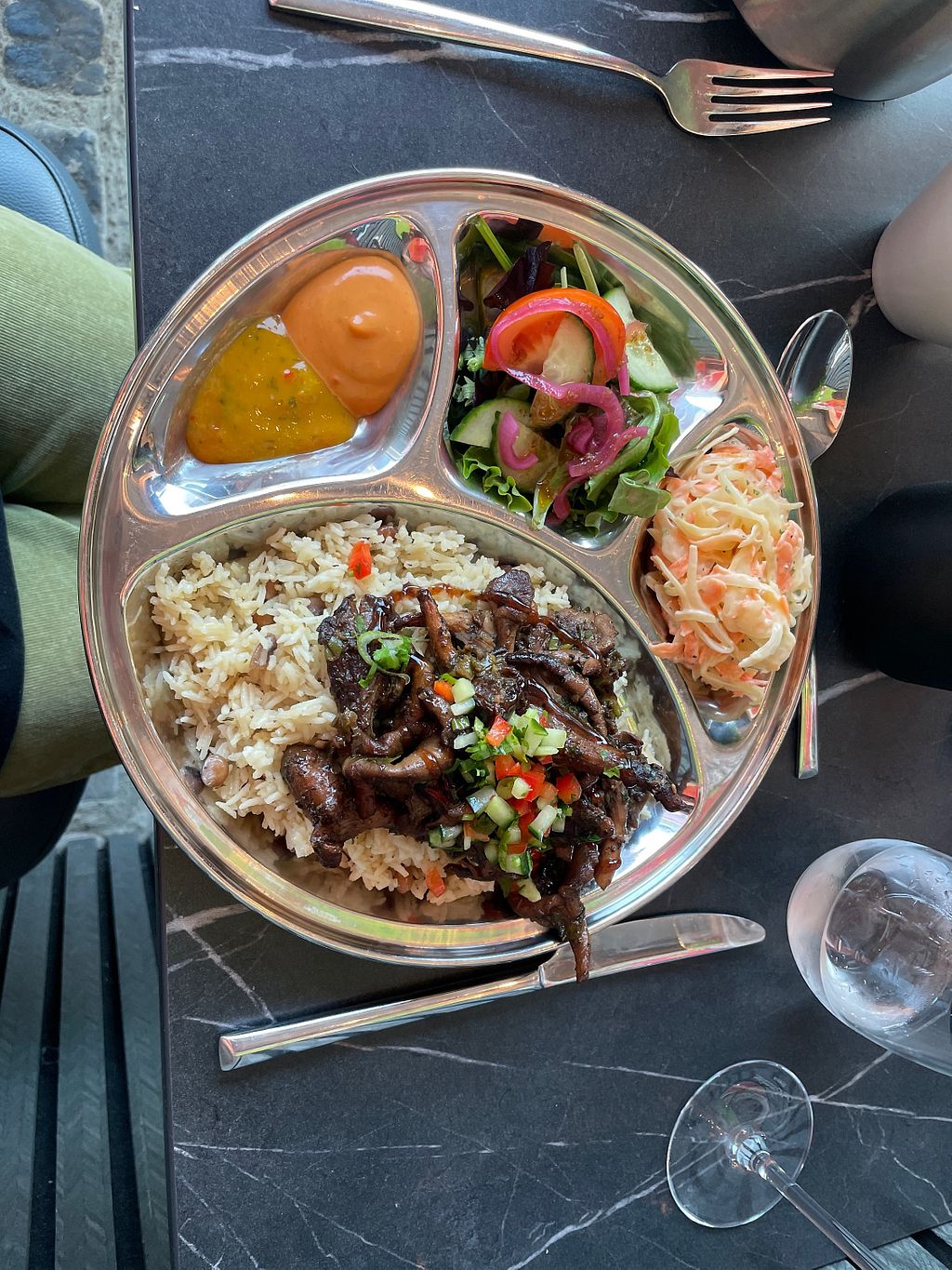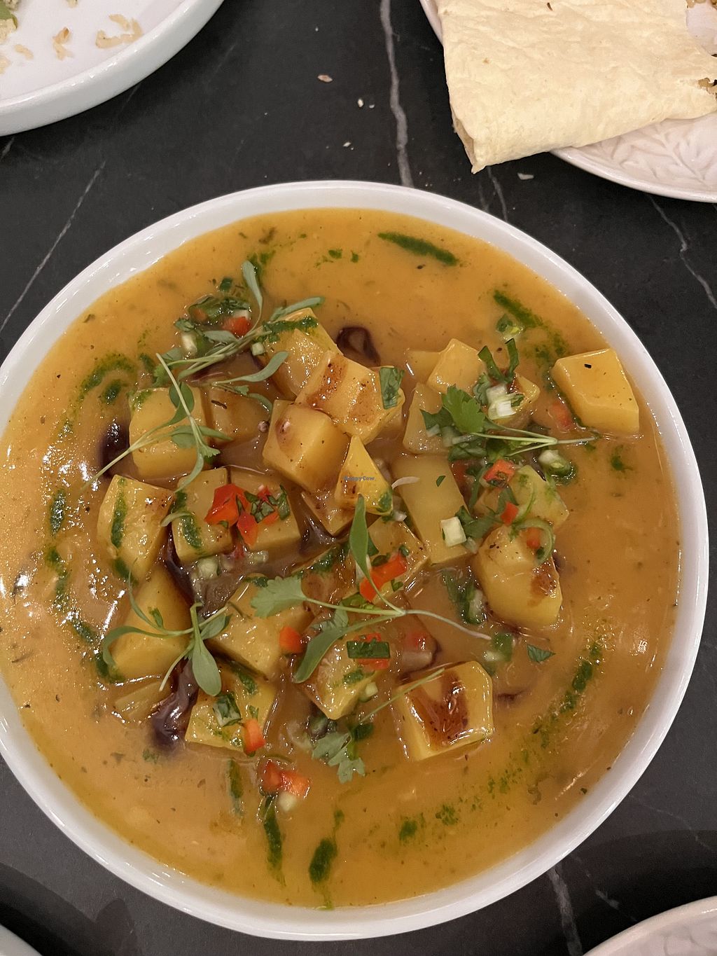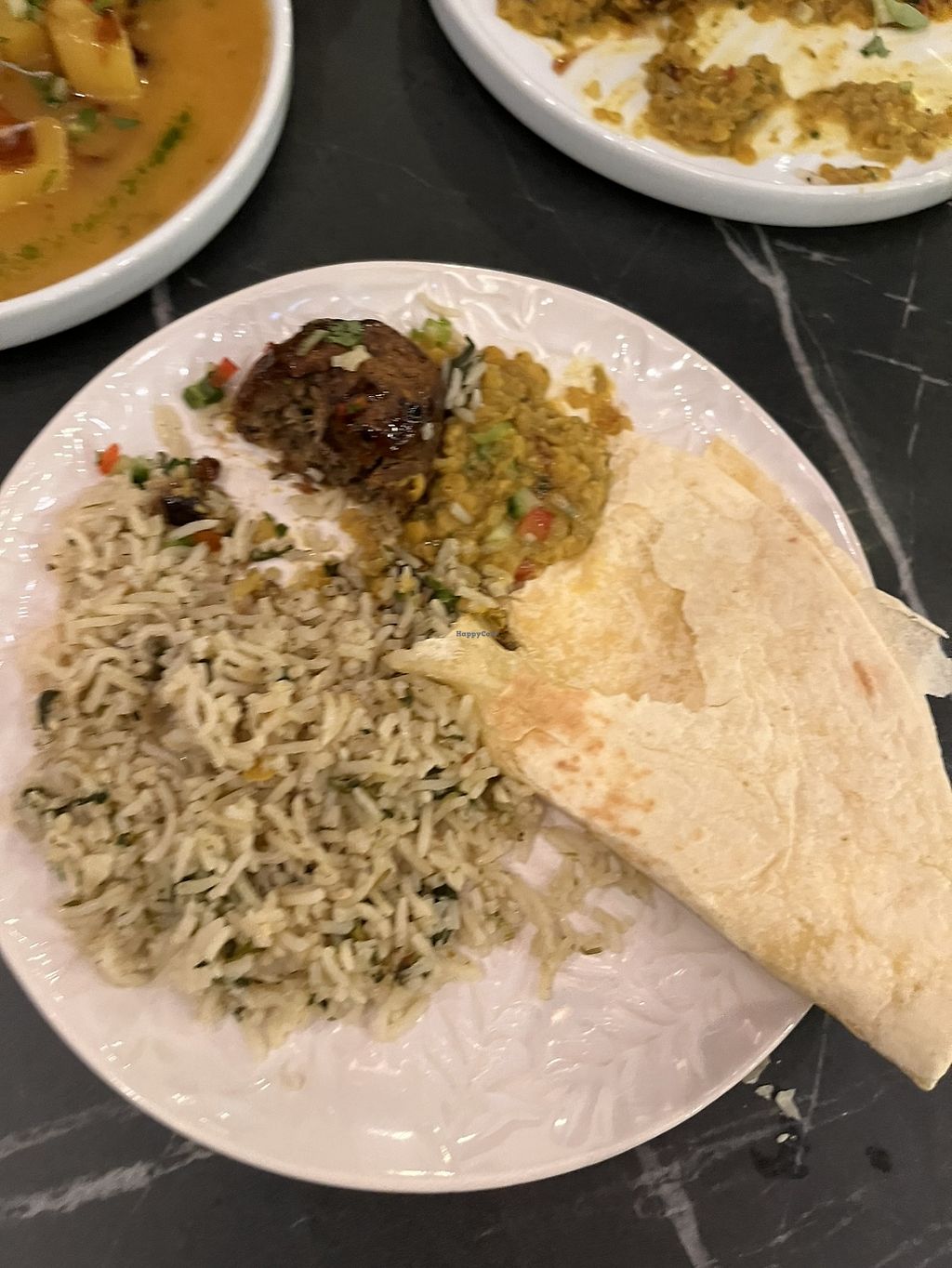 Nice place small but punching above its size on tasty food terms. Menu changes I believe but some constants possibly on the sides. Vegetarian marked but a quick ask as to what vegan and a check from very friendly staff meant all sides and one of the plates was but also said could do additional curry which was very helpful. Went for the plantain side spicy fries lovely rice roti and aubergine ‘meat’ ball dish. All of the food was beautiful. Will return.