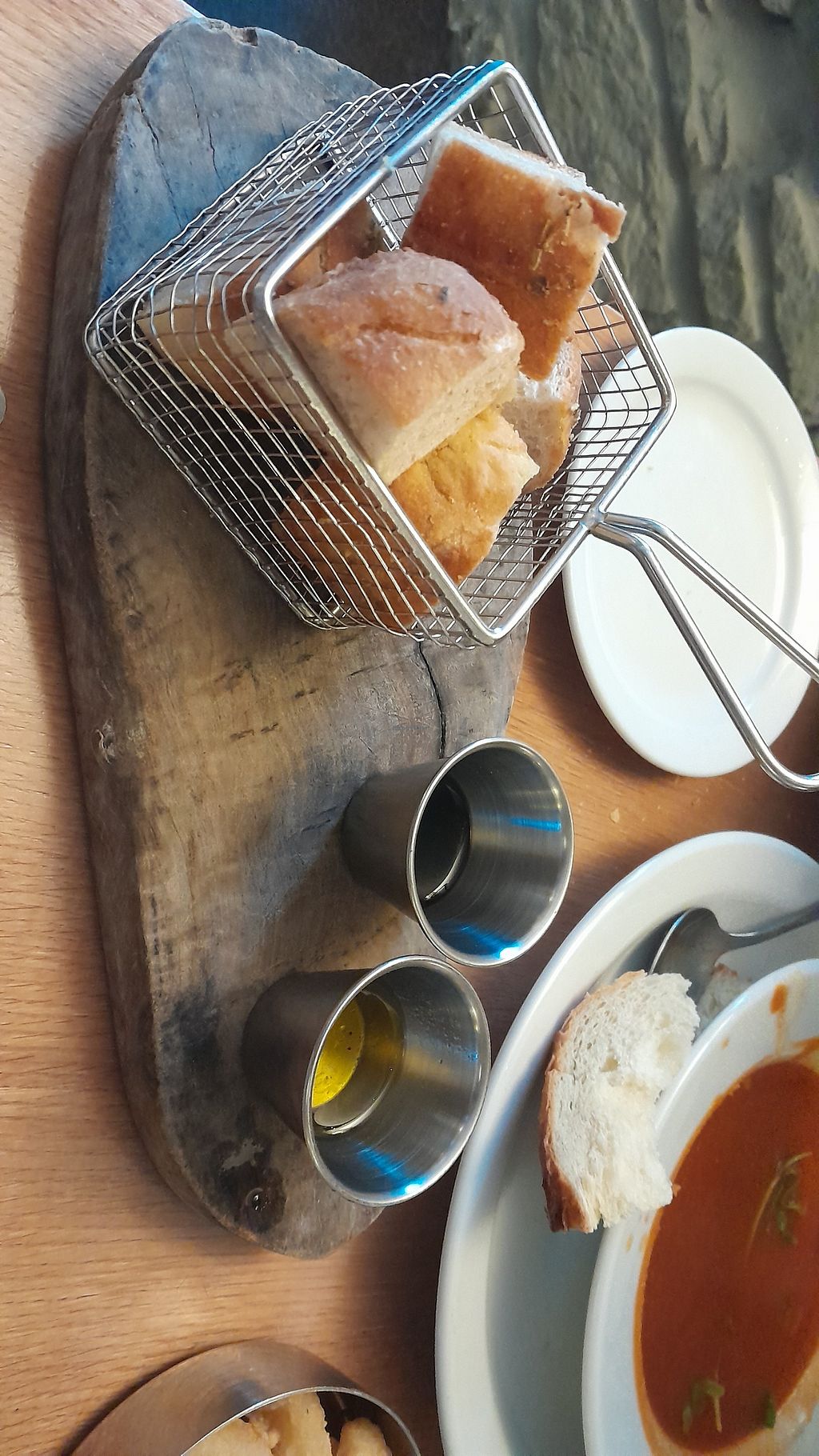 The focaccia and soup both vegan. 3 vegan mains (curry, tagine and burger).