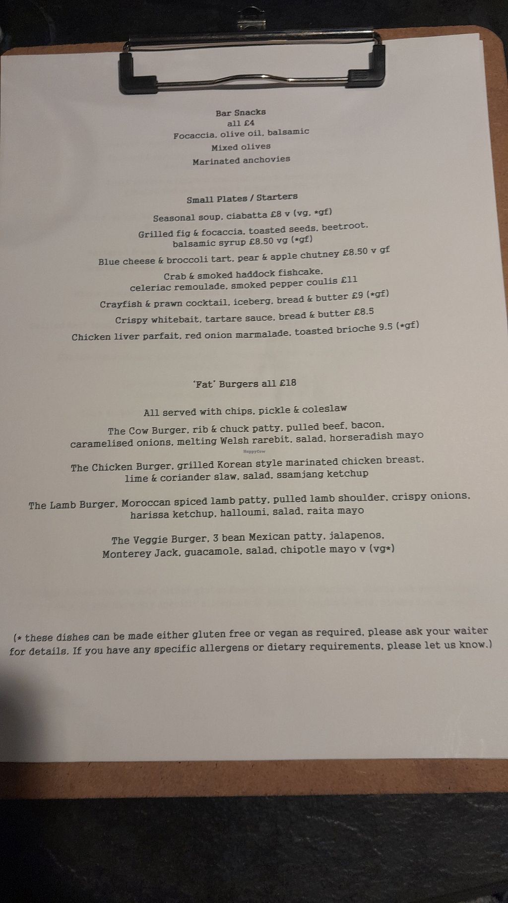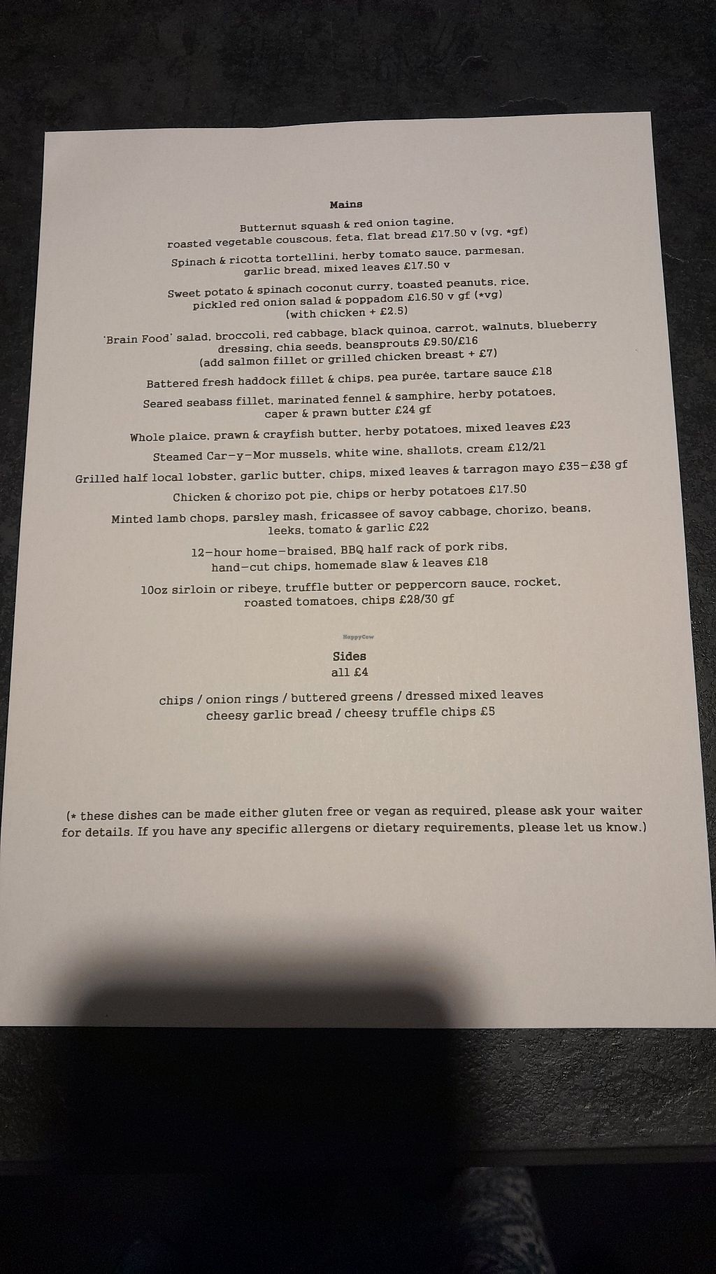 Had a separate vegan menu with 3 starters and 3 mains. We had sweetcorn chowder (great) and the burger and tagine. Great food in a traditional pub.