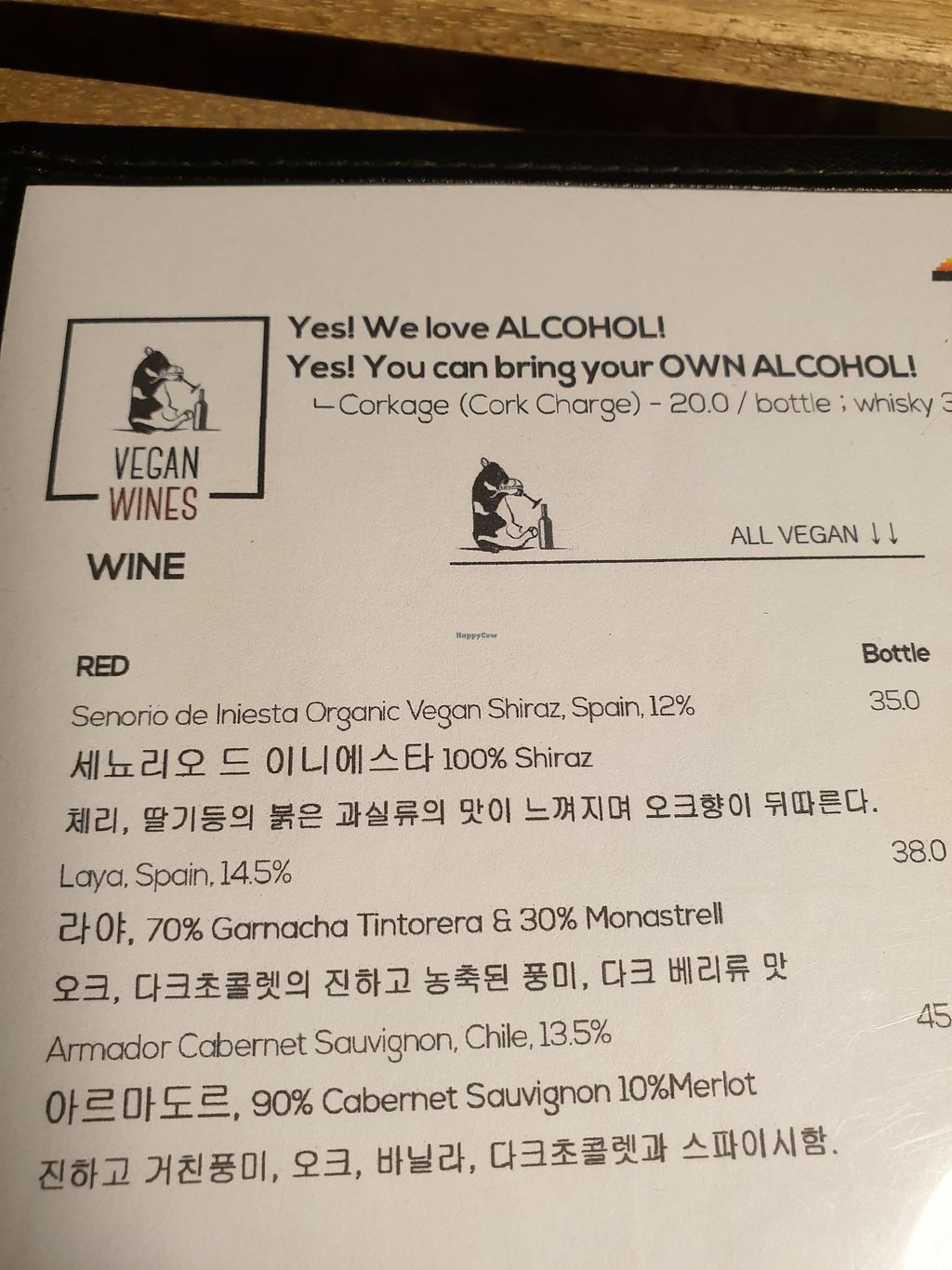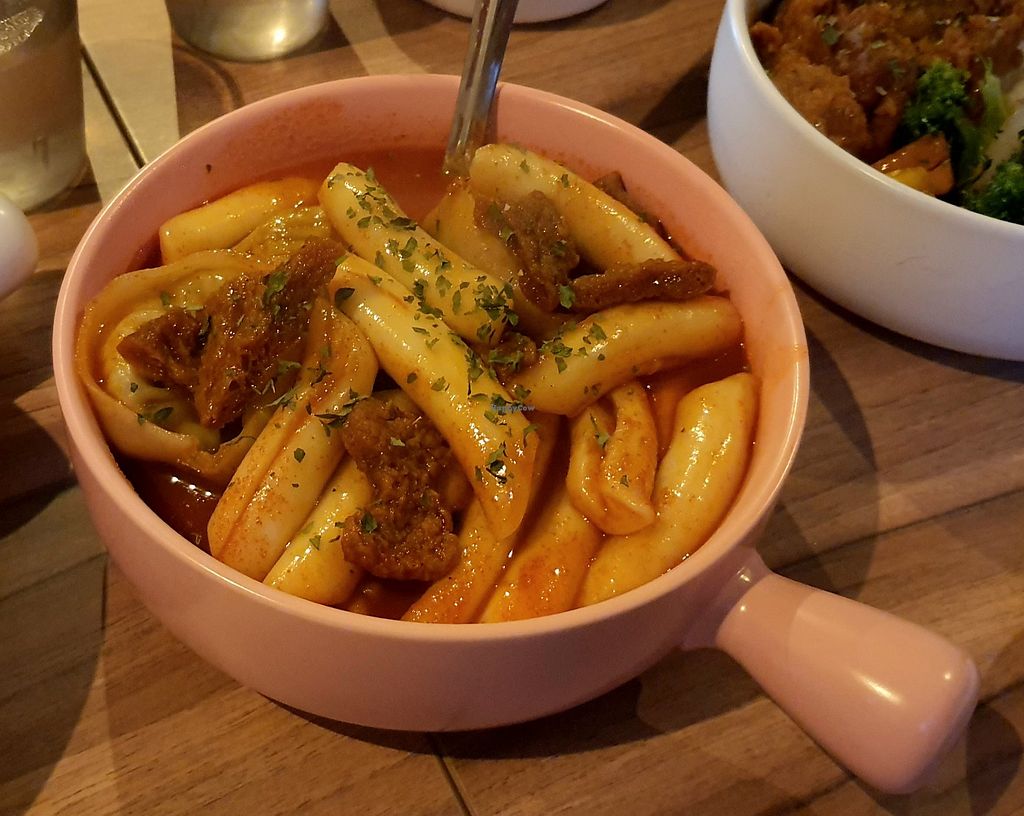 Read moreDuring the daytime, it functions as a bistro/café with a couple of vegan dessert items and simple main dishes. In the evening, it's a bar serving alcohol as well. There are a few vegan meals and snacks on the menu, which are clearly labeled, e.g. Tteokbokki 떡볶이, a vegan chicken wrap, vegan chicken with rice. They use plant-based proteins to replace meat and seafood, which is nice since food doesn't end up being the usual carb bombs by simply omitting the animal-derived components.