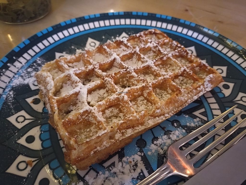 Pros: Vegan Belgian waffles and unexpected treat, Cosy atmosphere, Gender-neutral loo