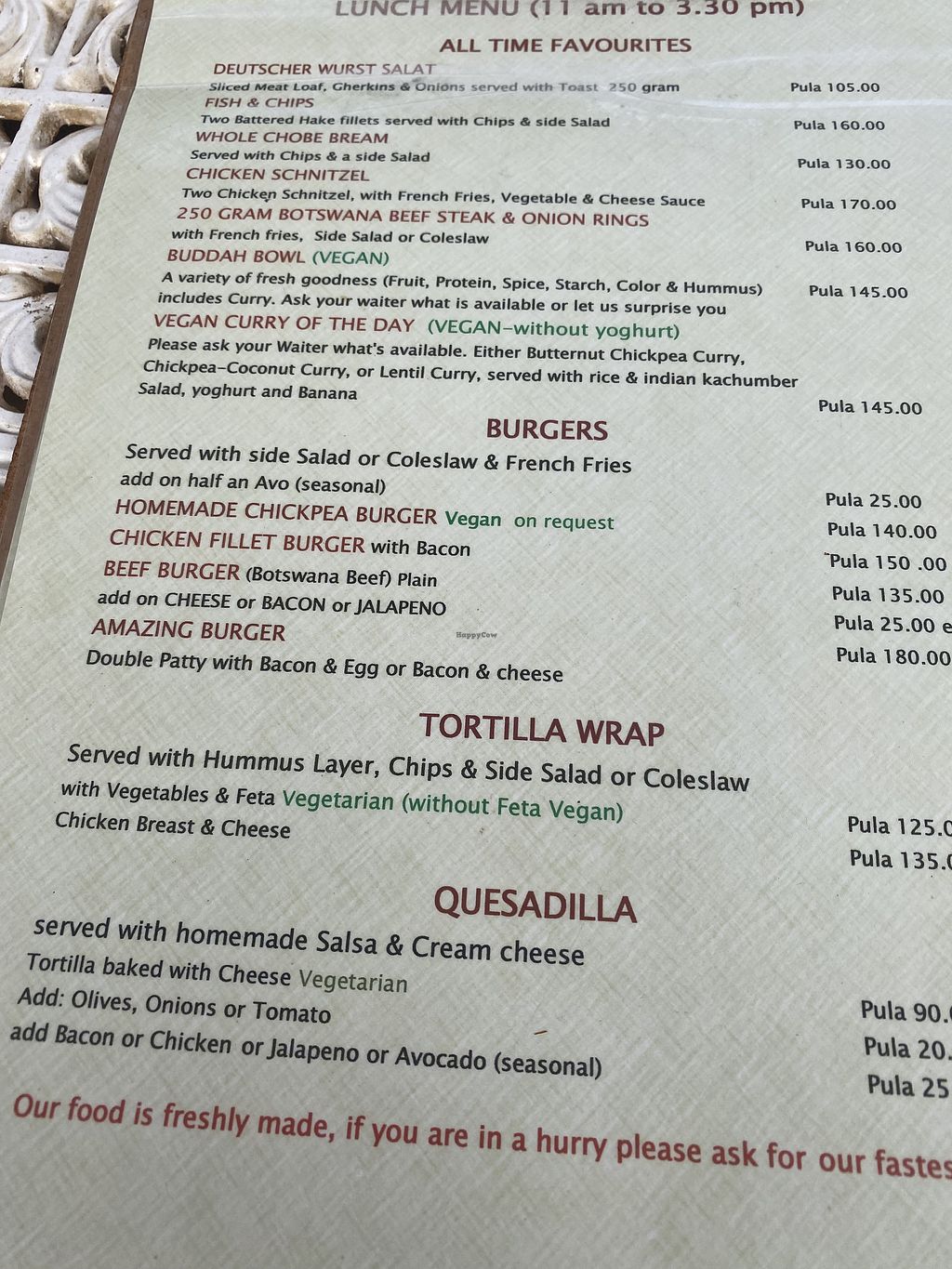So good I went three times during my visit to Kasane. Really lovely garden setting, quite a few vegan dishes marked on the menu. I had the wrap, they also had curry and vegan bean burger.