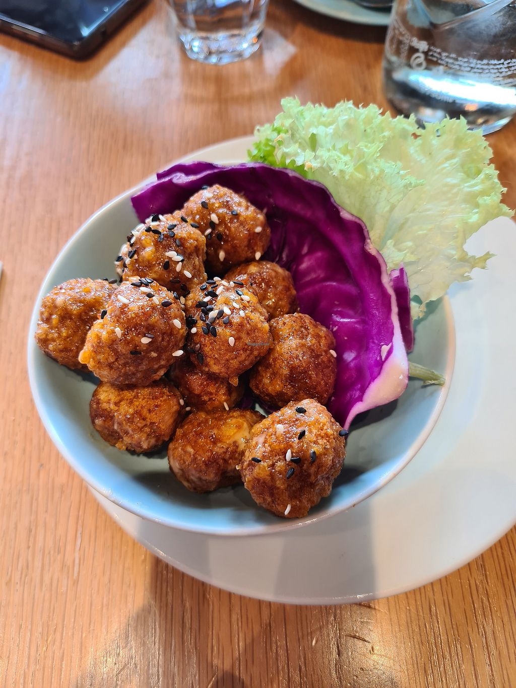 I had the vegan balls today which were really good and made of soybeans. Previously I have tried the salads, big breakfast and planet burger. All very delicious. It seems they have a new menu now with some new different things to try of which the vegan balls was one!