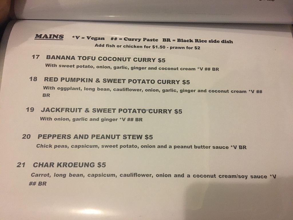 The Corn has many vegan dishes, marked properly with a "V".The vegetarian amok is also vegan, they just forgot the mark.We had a delicious jackfruit coconut curry and a tofu banana coconut curry, both served with black rice. The rice portions could be a little bit bigger.The owners are very nice and helpful people!