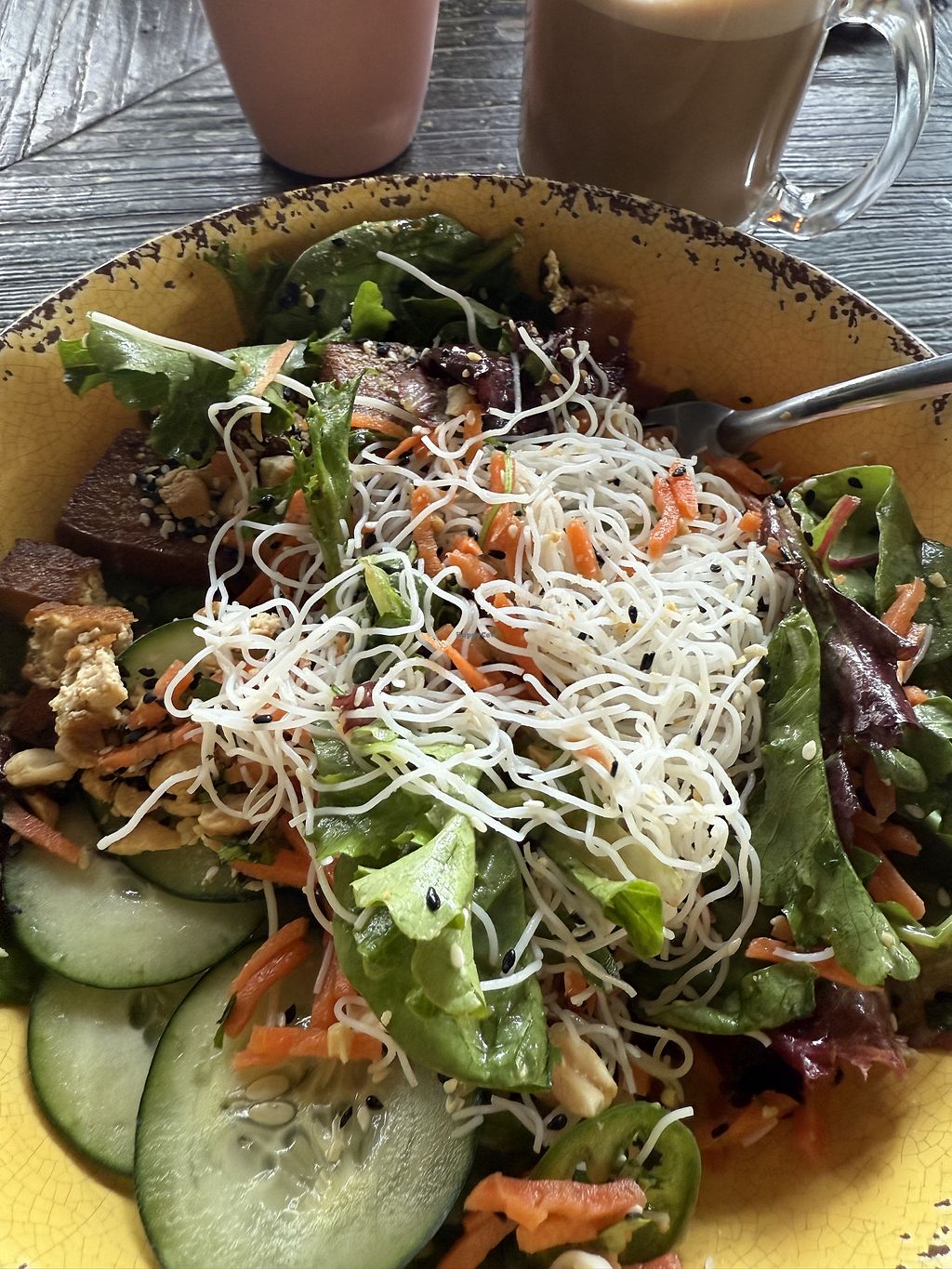 The Thai salad was excellent with a little picante kick. Loved it! My friends had the beet hummus plate and the mushroom panini which they thoroughly enjoyed. Highly recommended. They didn’t have much in the way of dessert but bc of an illness. So all good. I’ll definitely come back when I’m in Denver again.
