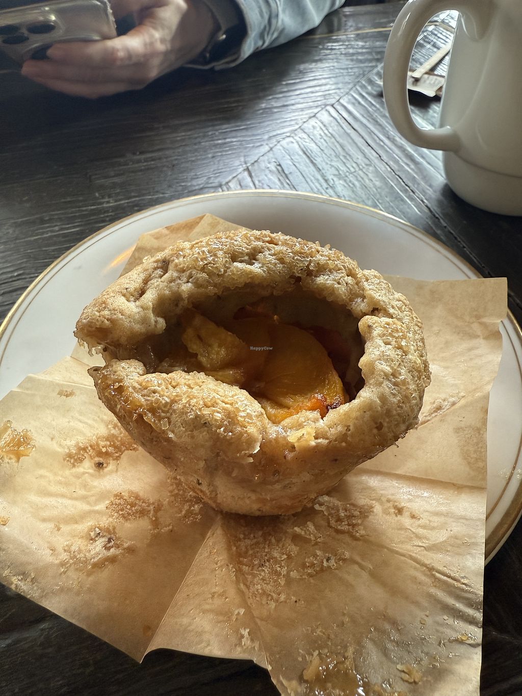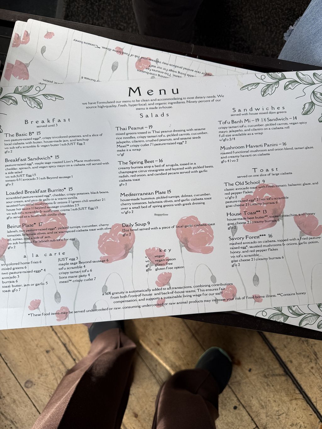 Great food! They also have a pleasant sidewalk dining area, which was unfortunately marred by the street construction right in front. We tried a peach golden cake, which was really good, but one person was disappointed because she said it tasted “vegan.” Also tried the Bahn Mi, the Florentine benedict, and the thai salad. Would go again. Counter service with food brought to your table. There was a constant line to order on a Saturday morning.