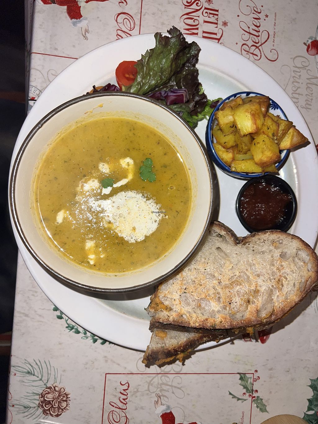 Vegan soup with the BEST vegan toastie I've ever eaten.