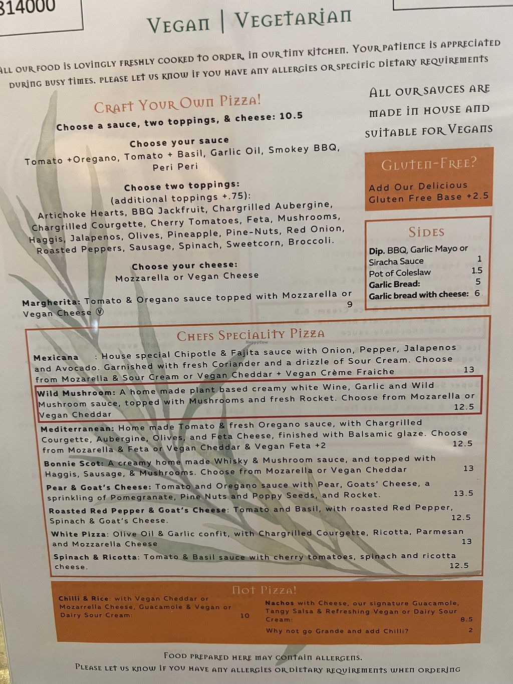 Got 2 takeaway vegan pizzas on our way back from mountain biking at Kirroughtree forest: the mexicana and the Mediterranean. Both were absolutely amazing, very unique and different. Every pizza in their menu can be made vegans. You can also build your own pizza.