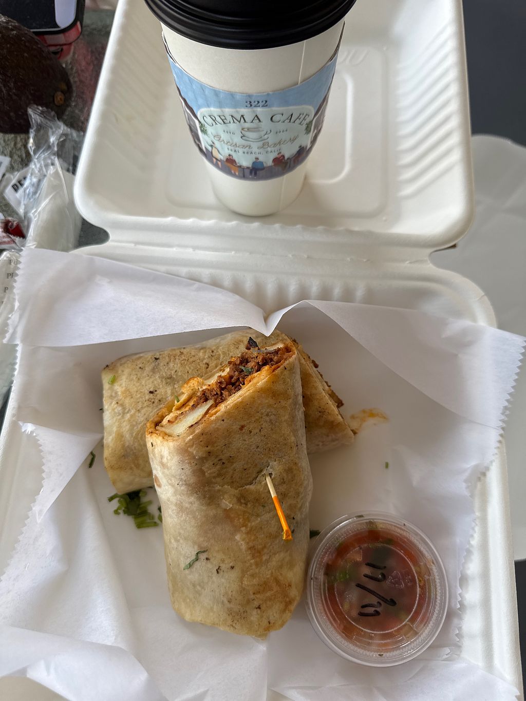 Vegan breakfast burrito. Decaf oat mylk vanilla latte - $1.50 upcharge…
