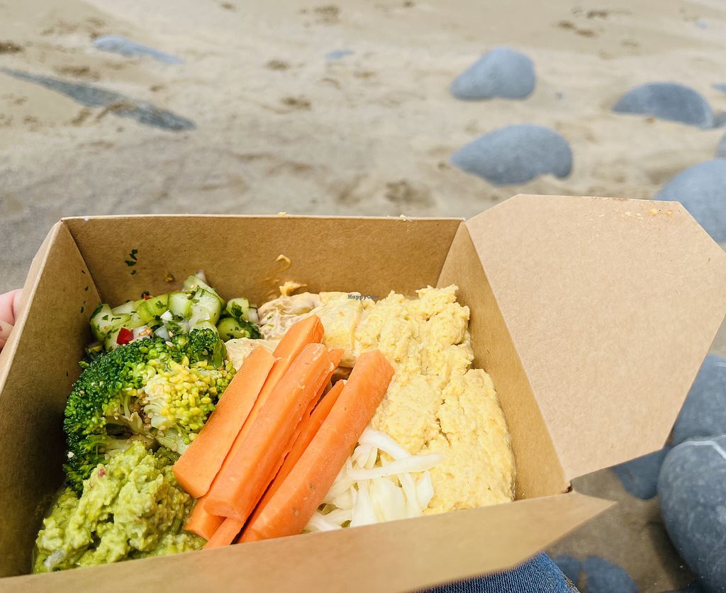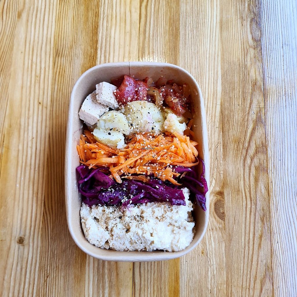 Vegan buddha bowl with hummus, lentils, quinoa, edamame beans, tofu fe…