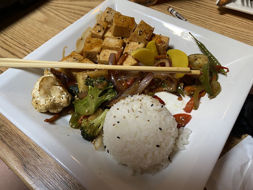 We enjoyed a nice family dinner here and while the food is good, it wasn’t standout… we are still likely to return because there are few vegan options in the area, there’s something for everyone in our family, and we loved all the ponds filled with lily pads and carp. The veggie sushi was good and there are a few standard options - I went for the veggie combo roll (avocado, asparagus, cucumber, and pickled radish) and it barely contained avocado. I ordered the tofu teriyaki which was good, and came with an abundance of lightly sautéed tofu, but about half the veggies I was expecting. The kids meal was awesome: we subbed tofu for chicken and got tofu teriyaki bento boxes (complete with rice, edamame, an orange slice and applesauce) for our girls. They have a weekday half-off kids meal special until 6pm which takes them from $12 to $6 - amazing! How I wish they had bentos for adults… They recently added a bibimbap dish to the menu that could be veganized. The server squinted and made a face when I asked if it had as many veggies as the teriyaki dish, so I ordered the teriyaki…
