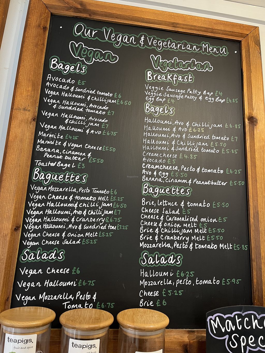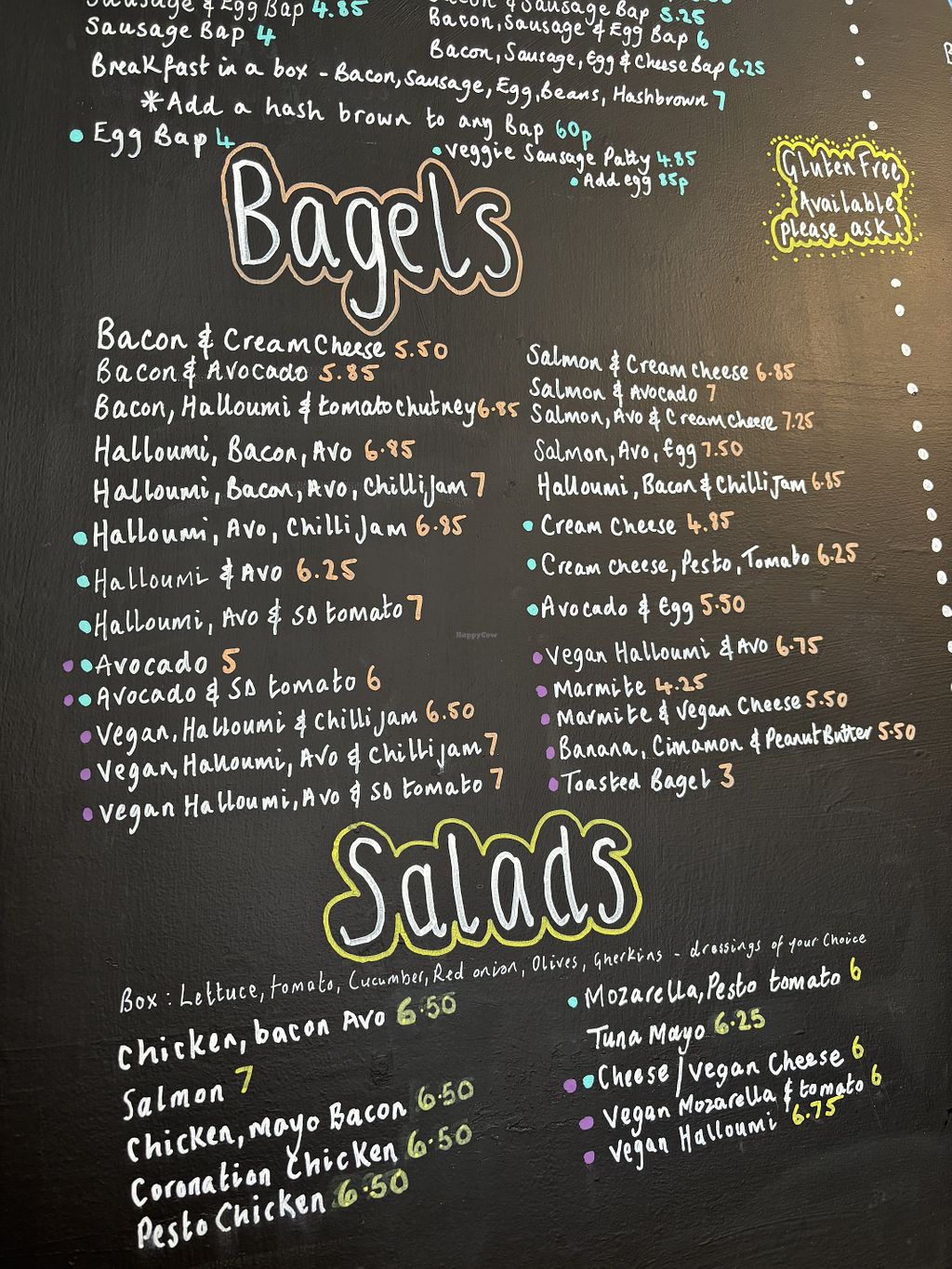 Lots of vegan options, baguettes , bagels, jacket potatoes, salads, milkshakes and muffins. Lovely friendly staff who make sure surfaces are cleaned and different utensils used when preparing vegan food.