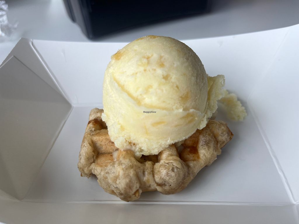 This place is super cute with a couple different vegan options! There’s a vegan waffle and they have a set vegan flavor (birthday cake) along with a changing vegan flavor (pineapple coconut). I had a scoop of the pineapple coconut ice cream with the waffle which tasted amazing! The vegan waffle was soft and the ice cream had lots of flavor! Also, the staff member was super sweet and even changed gloves to avoid cross contamination. Definitely would go back!