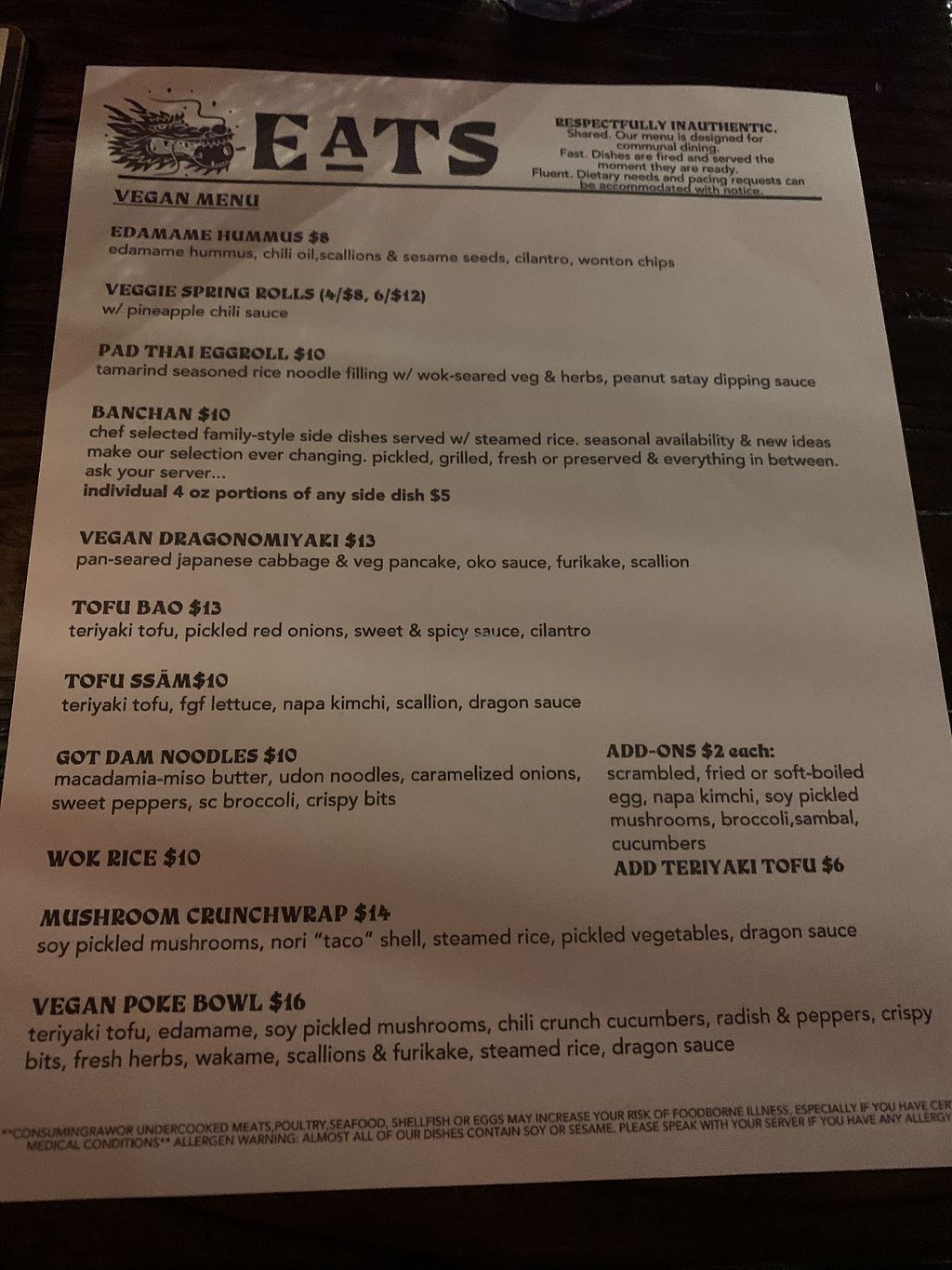 New vegan menu has me blown away as a vegan of 5 years. Everything was 10/10, will definitely be coming back soon. Portions are larger, and the vegan menu is a WHOLE page long. Feels like a special service! Delicious