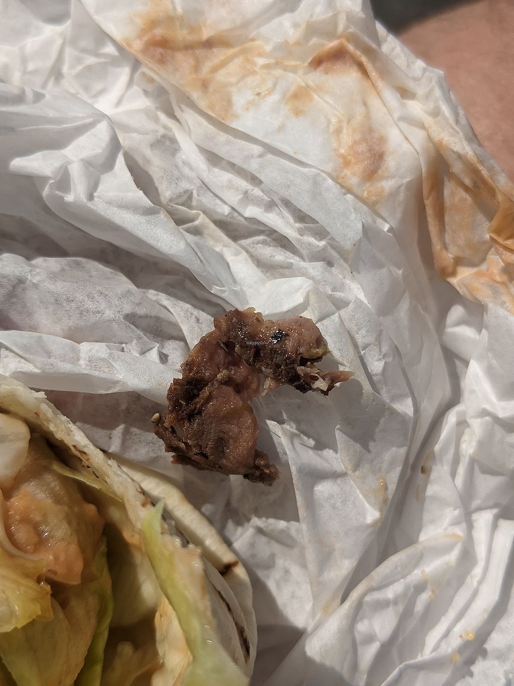 PIECES OF BEEF IN A VEGAN LABELED WRAP.
