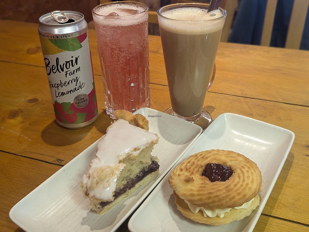 Viennese swirl and Bakewell tart cake, chai latte and pink lemonade
