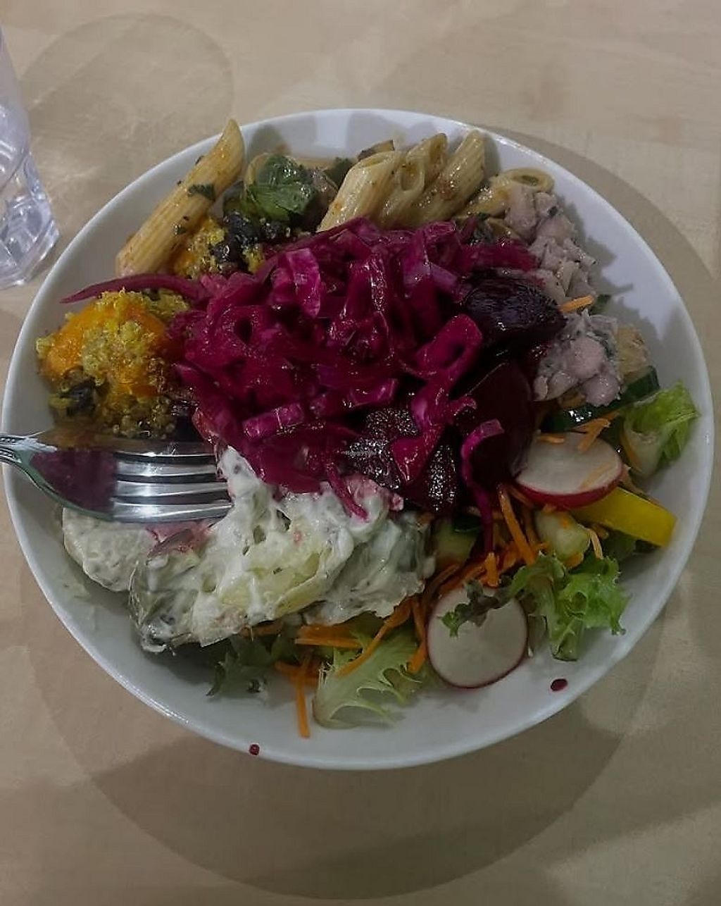 The cafe is 100% vegan and serves delish, proper food. The menu changes regularly, but always has a dahl, stew and two mains as well as a salad bar. I had the enchiladas with avocado cream & a side salad. Truly delicious, wholesome food. They also offer oat, soy, almond & coconut milk for coffees.