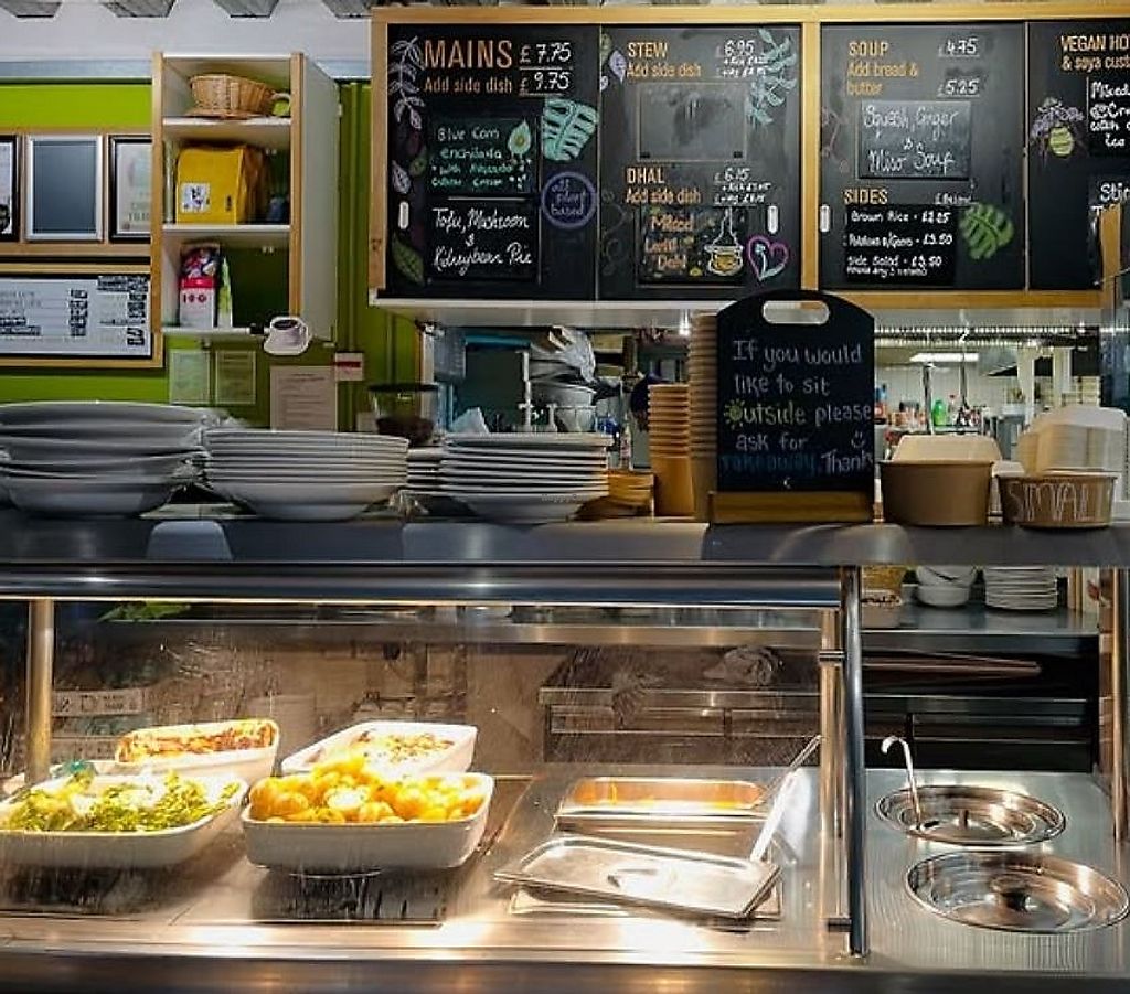 after lockdown the cafe went vegan. Daytime/lunch menu ,from 11 has 2 mains ,a stew and a dhal plus salad bar and a selection of cakes.