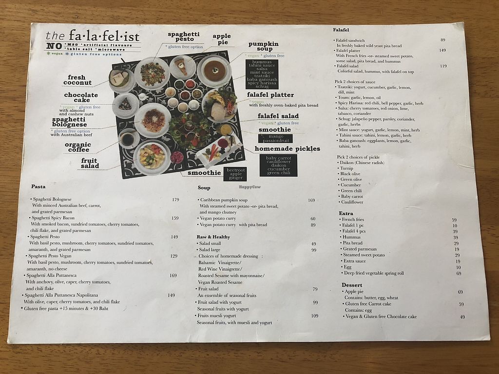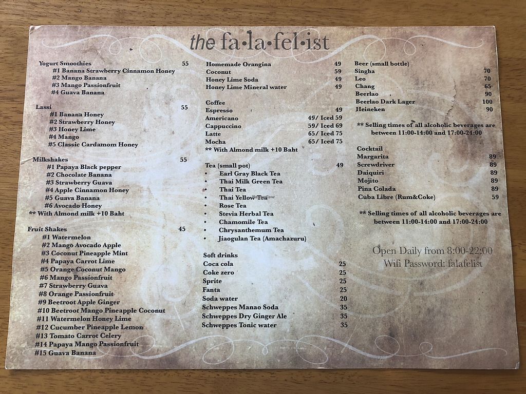 For ca. 360 baht we had a large dinner including drinks for 2. The falafel salad is huge and really delicious and fresh. You can choose between 4 dips and 4 kinds of pickles (2 of each) and get hummus to your dish. The Salad, the falafel and the dips are so tasty! One of the best falafel we ever ate. The smoothies are also really good. And it's great that the Sweetpotatoes are not fried, they are so delicious. Awesome falafel place.