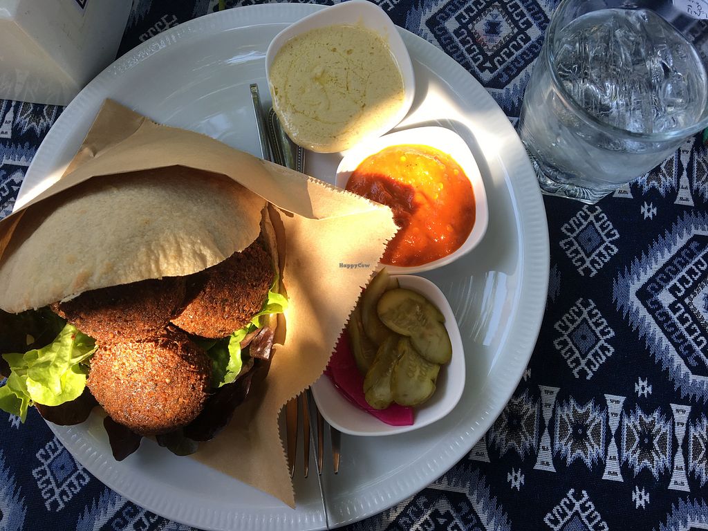 The food we ate here was delicious, especially with all the side sauces and pickled vegetables on the side. Fresh salad and very yummy falafel. When you order the platter or falafel salad you choose 2 sauces and 2 pickles. We suggest getting the harissa if you like spice and the tahini and tzatziki was amazing! Lovely atmosphere, good service and good value.