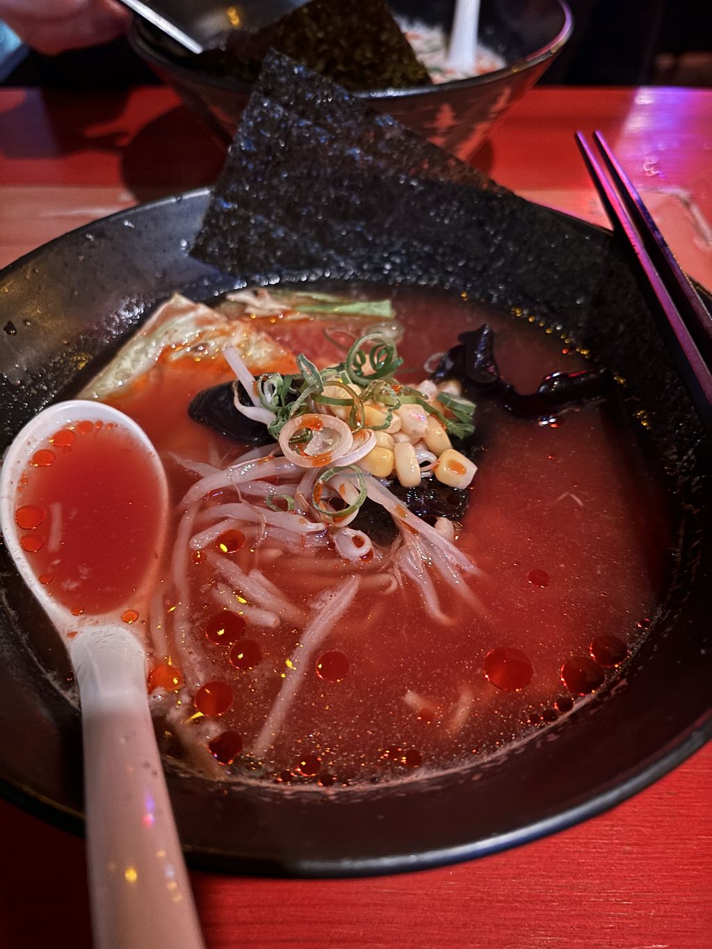 This spot was a bit out of the way but we went because it had amazing reviews. We ended up kinda disappointed. The description says they specialize in late night food but they were sold out of both sides so ramen was the only food option. (Someone else said the sides were sold out for them too.) no tacos either- not even on the menu. We got the tomato base ramen and sesame base ramen. We feel they both lacked in toppings (amount) especially for the price and the fact they didn’t include any protein option ie: soy meat or tofu. They also wanted to charge extra to make it spicy😡the tomato broth was yummy and we both thought the sesame was wayy too sweet and a bit grossly so imo. They had a nice drink menu, I just got one (chili Moscow mule) which was okay. I like that they had a fully vegan menu and it was a cool vibe inside but also not a lot of seating.