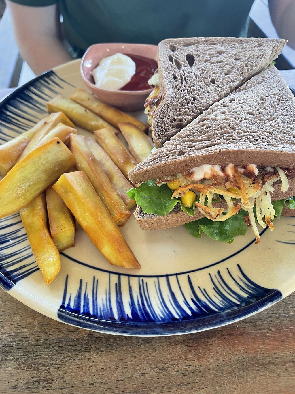 Although it’s not on the beach, it has a very relaxing garden. The shaded area was cool even with the sun being super hot. I had a quesadilla that was quite full of ingredients including very creamy cheese alternative. The coconut coffee was quite good and the whole coconut water was ice cold with a whole lot of water inside. The hammock was a nice place to chill when the sun started going down.