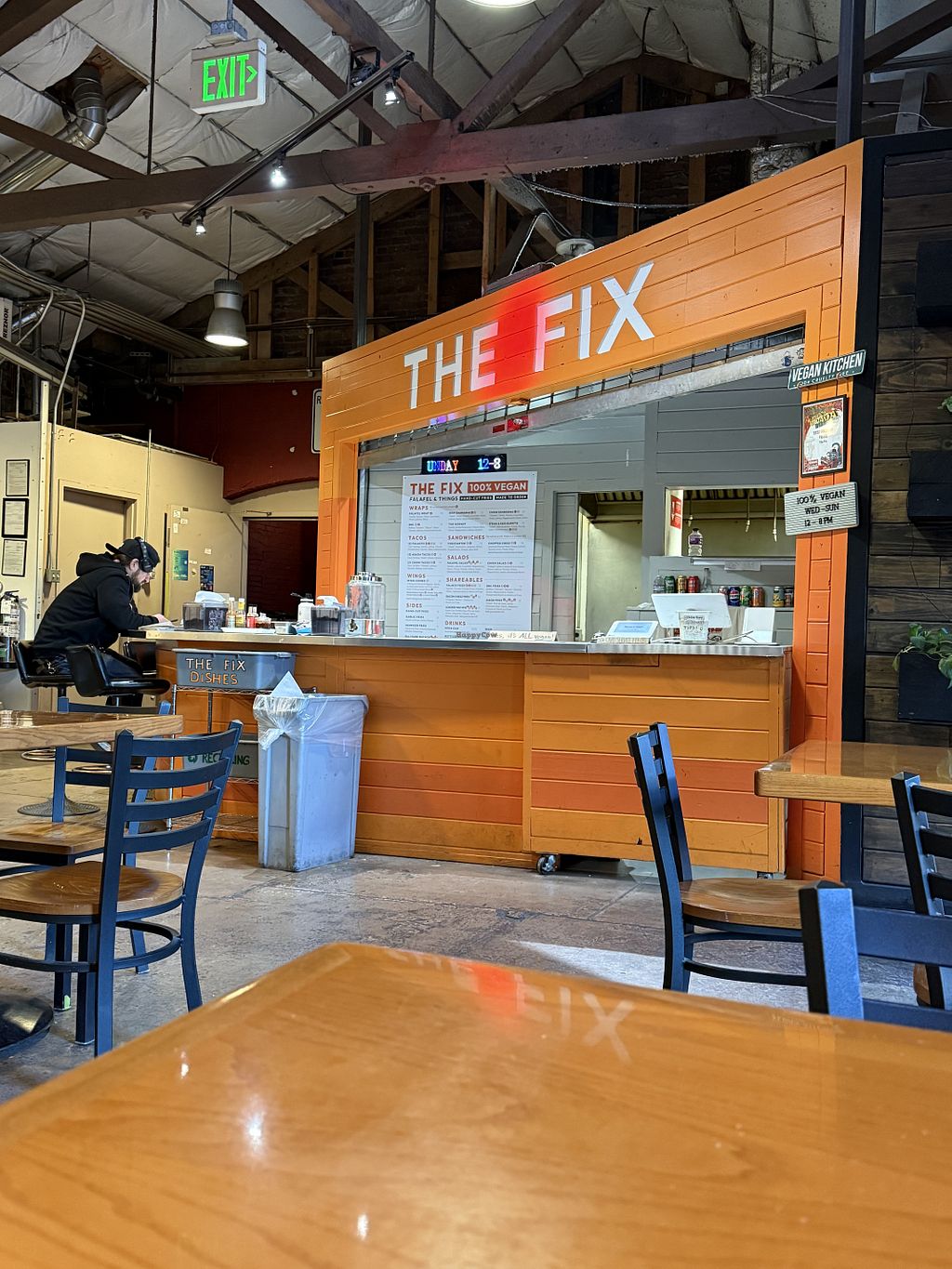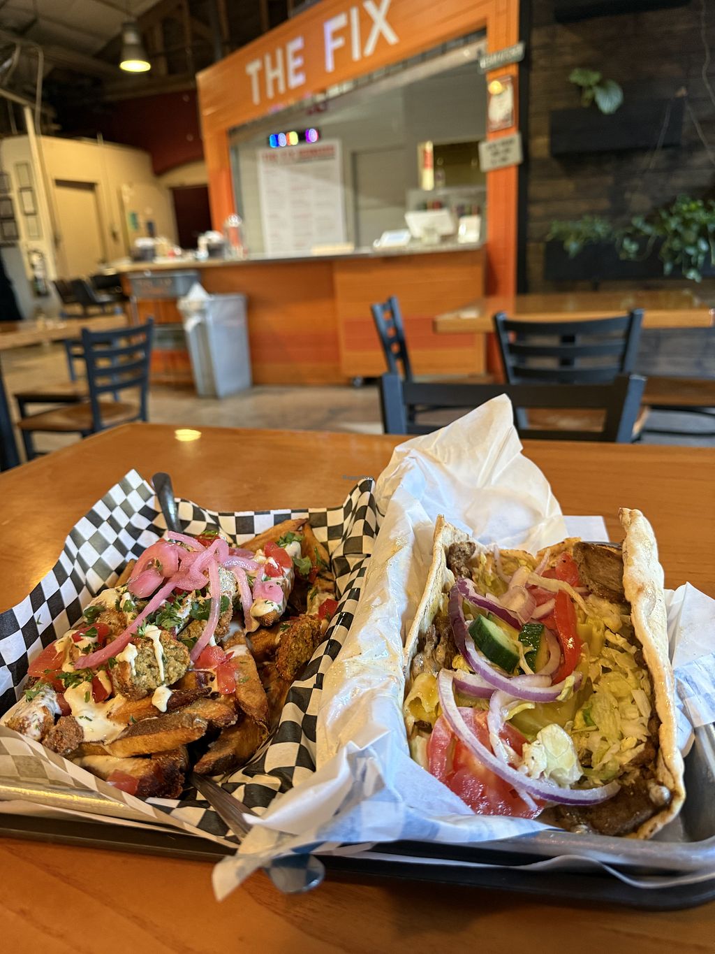 We stopped by The Fix on our I-80 road trip. Happy to find outdoor dining in a charming courtyard with picnic tables. We shared a couple dishes, but the Chopped Cheez sandwich was the by far the star. We also tried the Wing Combo with Buffalo sauce and seaweed hand-cut fries which were good, just not the Chopped Cheez.