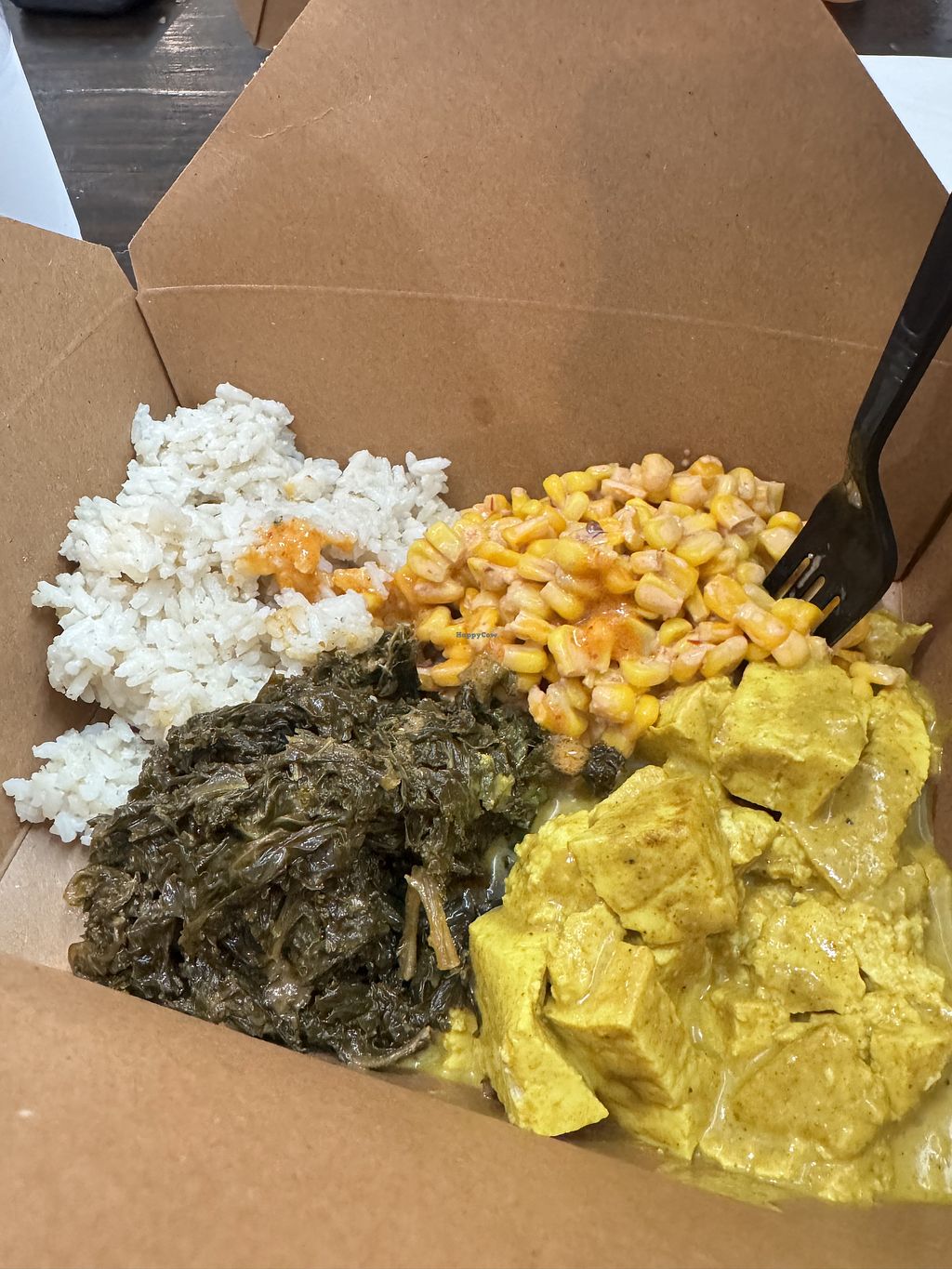 Callaloo, savory sweet potatoes, black beans, brown rice, curry tofu-A…