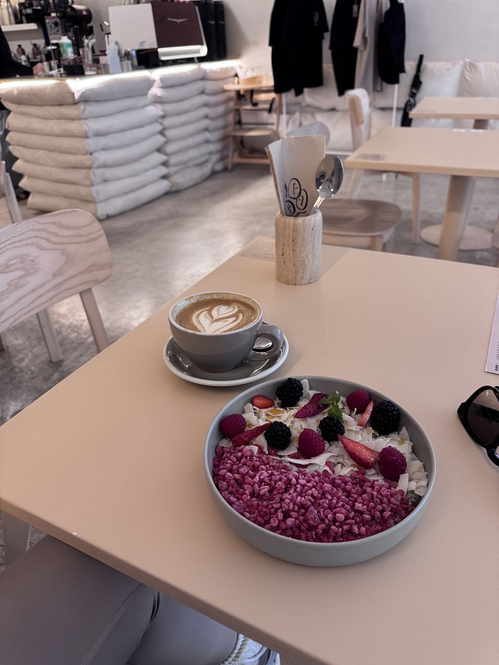 Interesting vibe, but limited vegan options. Coffee was good and the chia bowl I got was great too. I wish they had more vegan options and more plant milks options, not just oat.