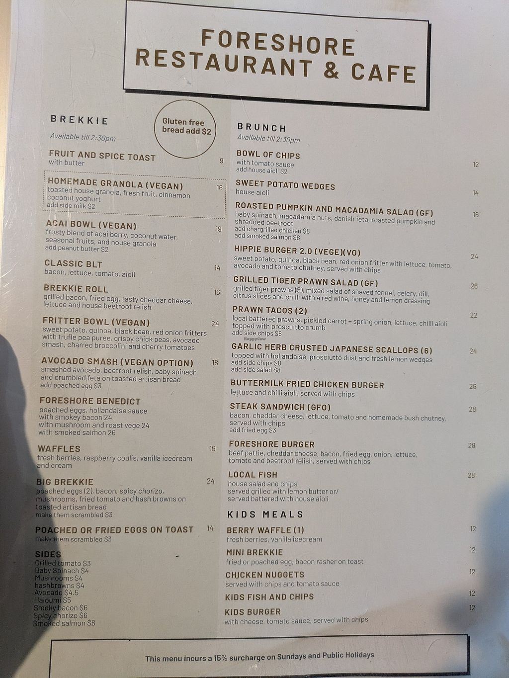 Serves meat, vegan options available. Restaurant and cafe with a few marked vegan choices and other items which can be made vegan, including: acai bowl, vegan breakfast, avocado and eggplant parmi. Open Mon-Sun 7:00am-10:00pm.