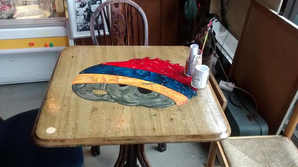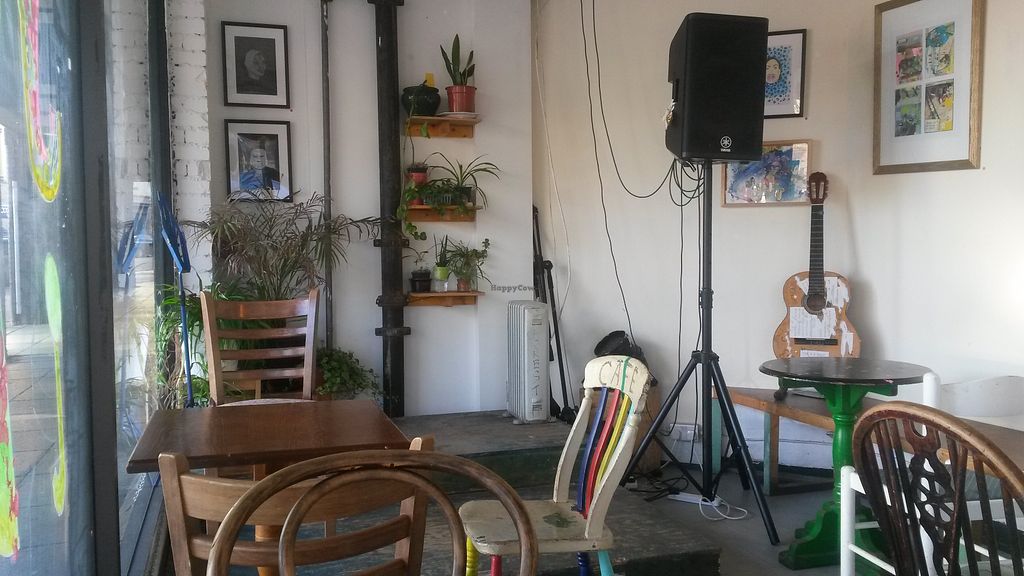 Murals. Mismatched furniture. Marvellous beans on toast, veganable. Seems like a very community focused place, there's free breadbin.