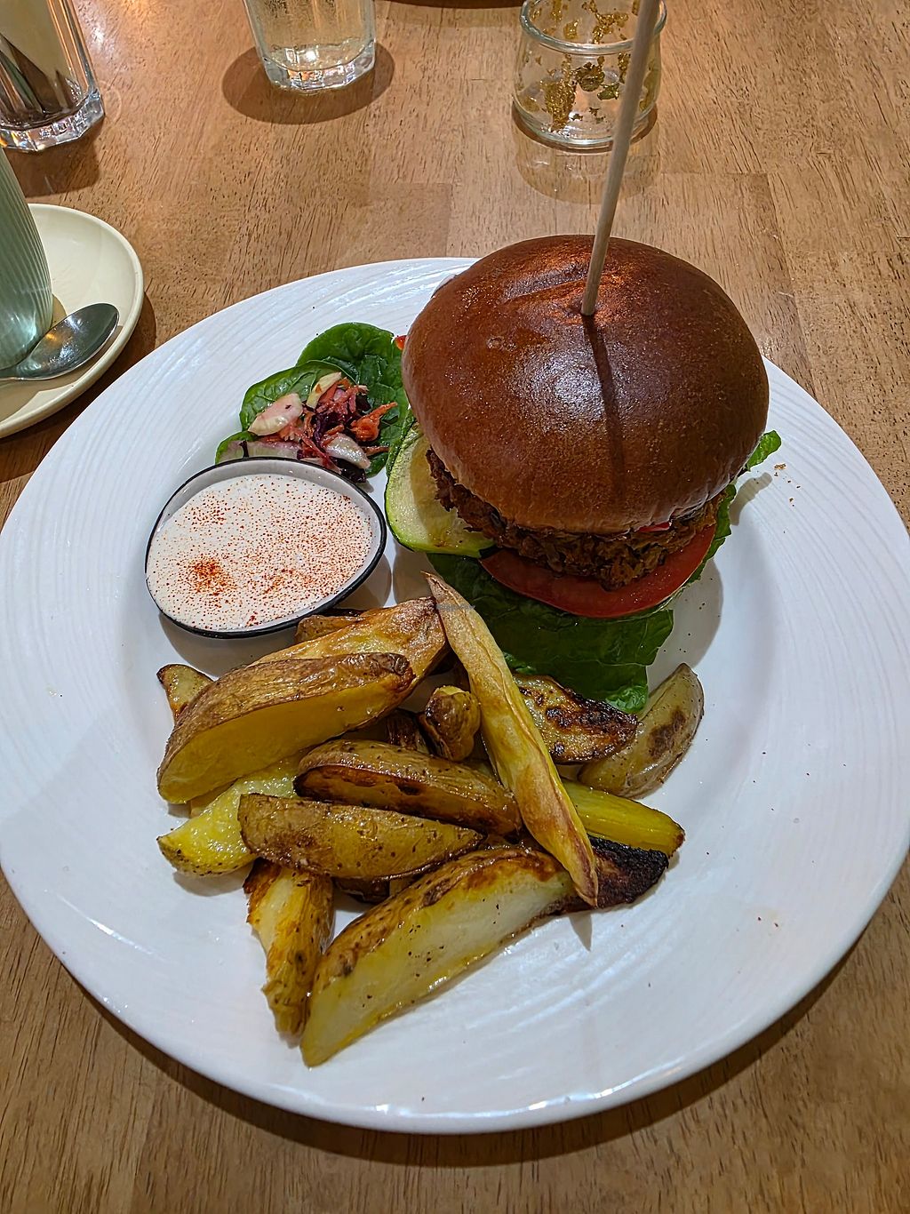Den Vibe im Restaurant fanden wir etwas gewöhnungsbedürftig. Die Kartoffel Wedges waren eher wie Ofenkartoffeln zubereitet, die Sauce dazu war aber echt lecker. Der vegane Burger ist auch zu empfehlen.